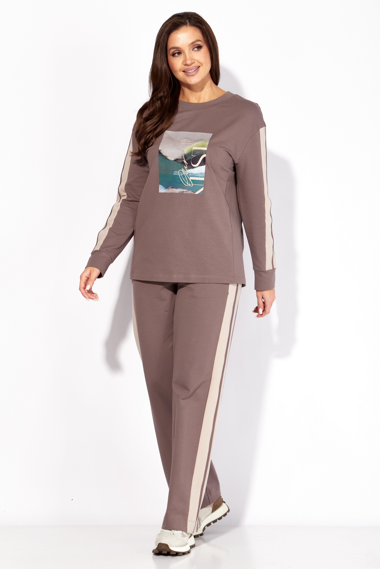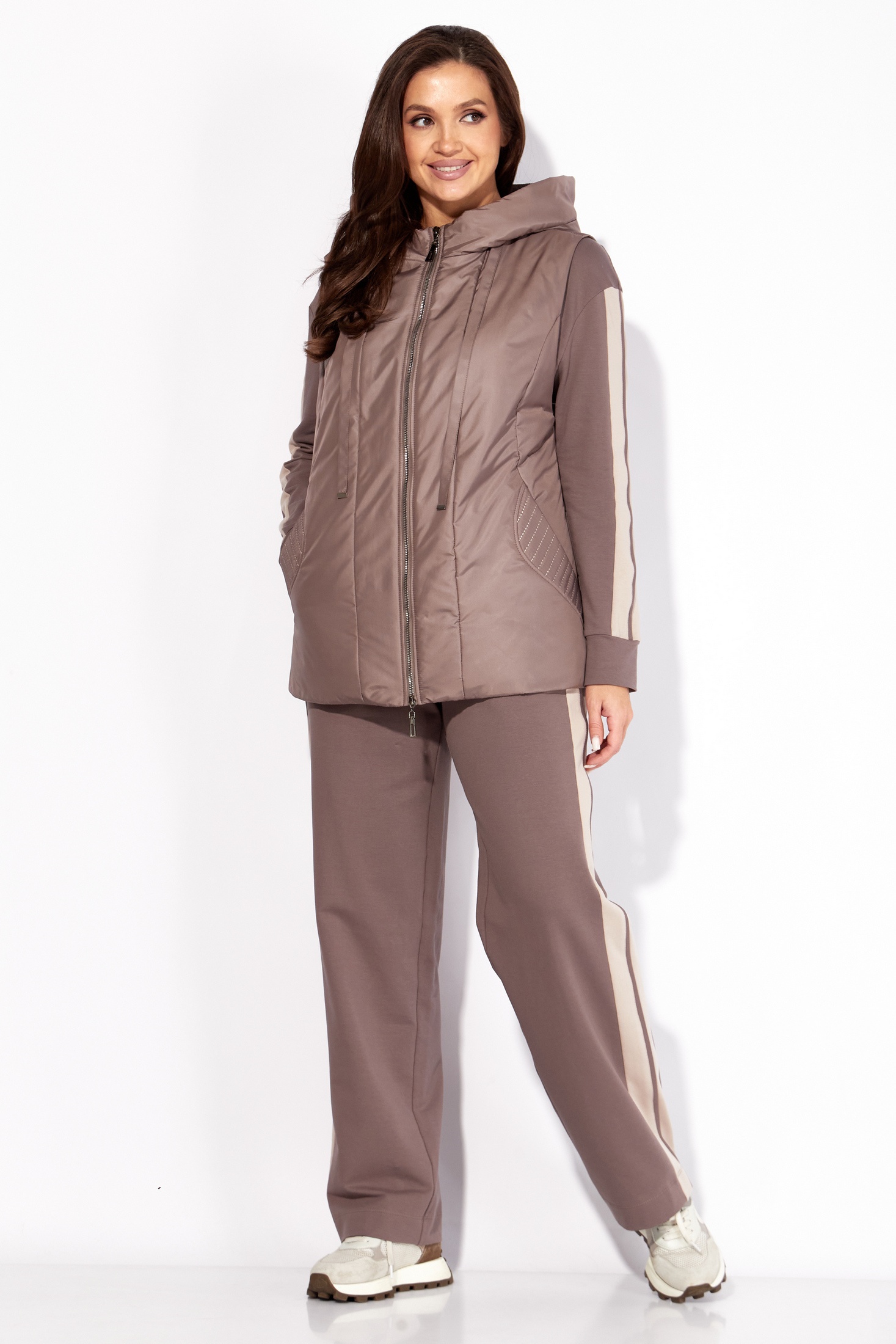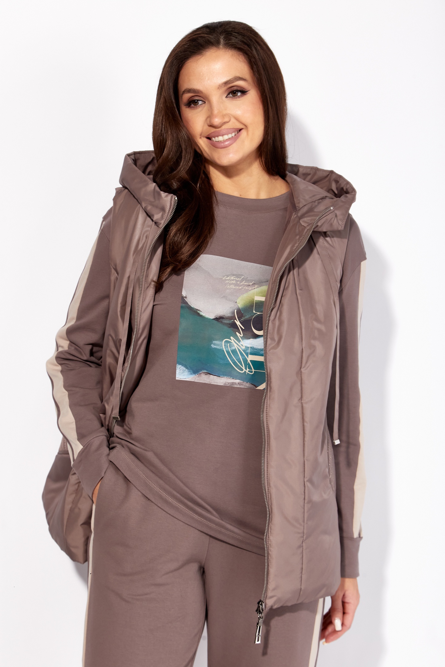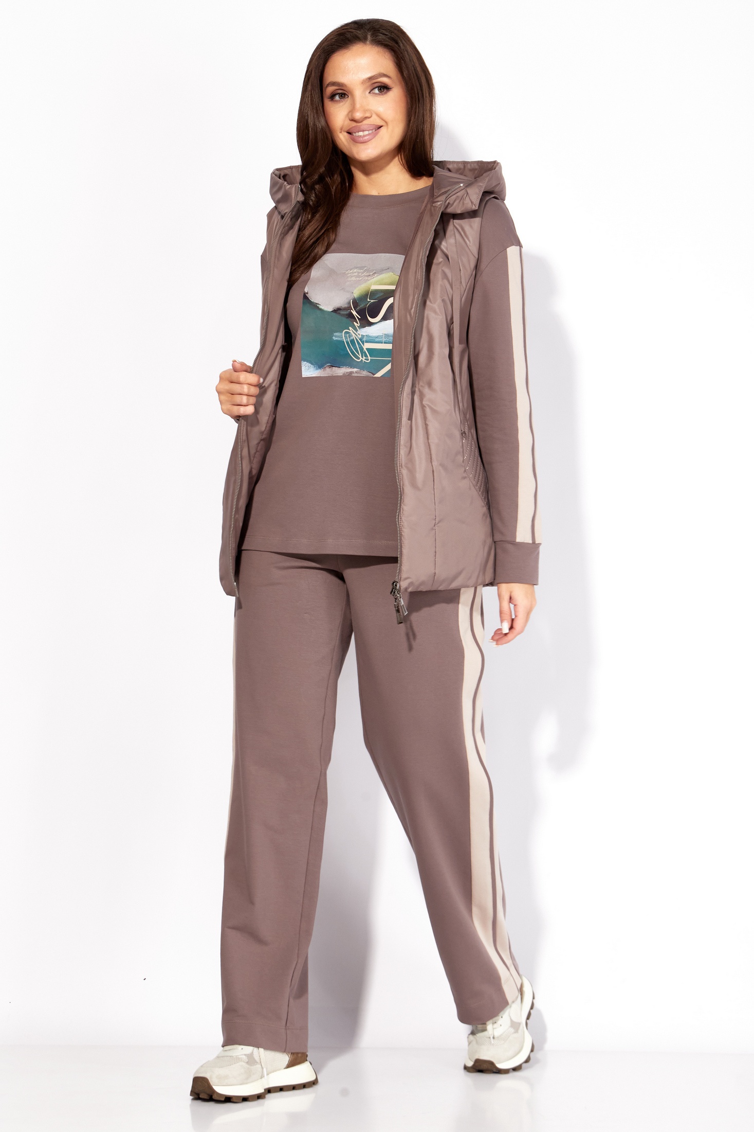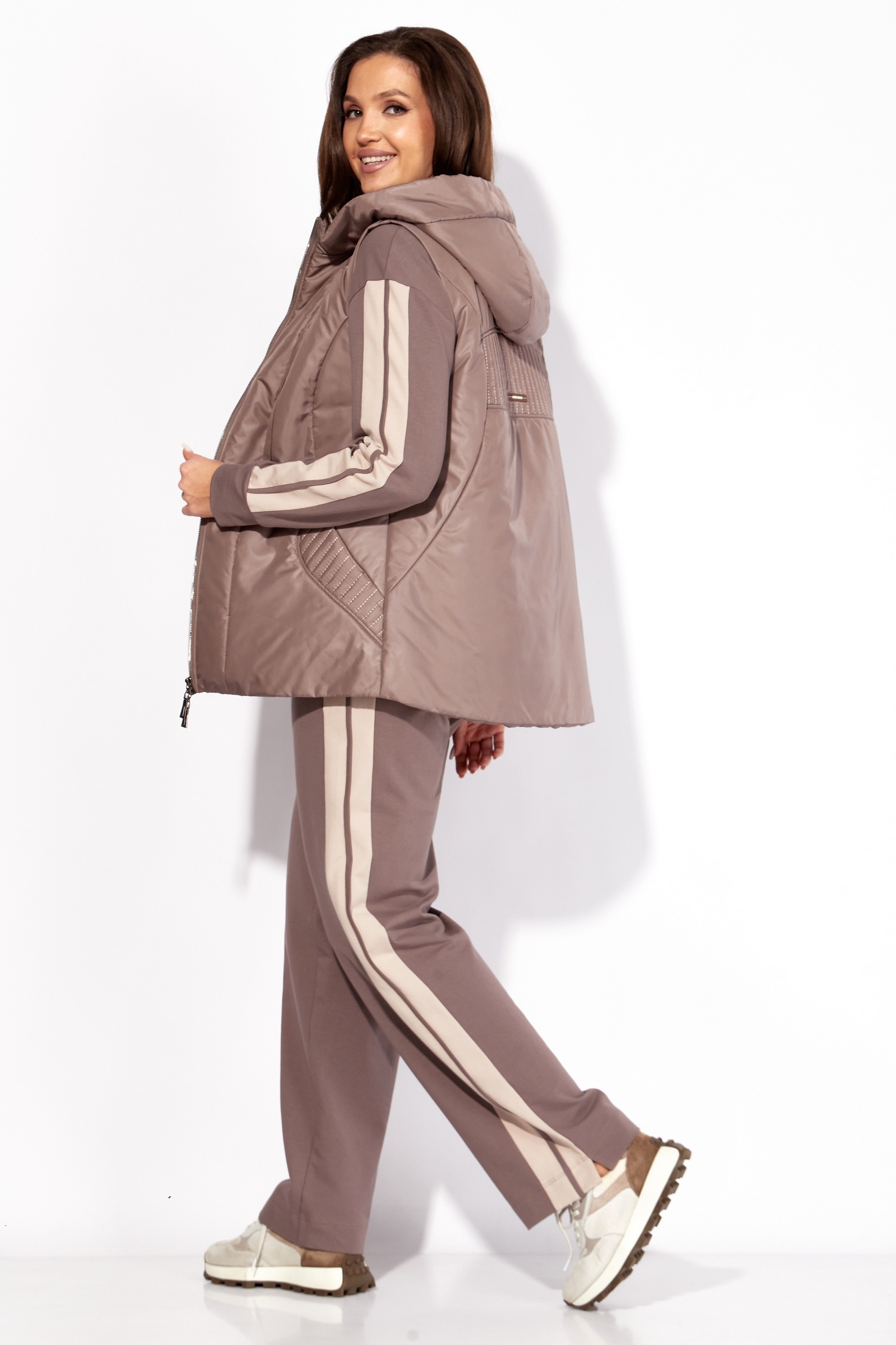 Свитшот прямого силуэта с отрезными бочками. Рукав длинный, со спущенной линией плеча, снизу на манжете. Горловина круглой формы с подрезной бейкой. Перед задекорирован принтом. Брюки прямые с карманами в боковых швах. По низу небольшой разрез. Пояс притачной с резинкой (по центру гладкий). По бокам брюк и по центру рукавов втачные отделочные лампасы с контрастным кантом. Жилет выполнен из плащевки на синтепоне (vs100) на подкладке, прямого силуэта. По переду рельефы из пройм в боковой шов. В рельефах карманы с отделочными деталями в форме клапана. Застежка центральная на тесьму-молния. Горловина оформлена капюшоном со стойкой и кулисой. По спинке фигурные рельефы. Центральная часть с отделочной деталью и декоративной нашивкой. Низ жилета по спинке чуть длиннее.