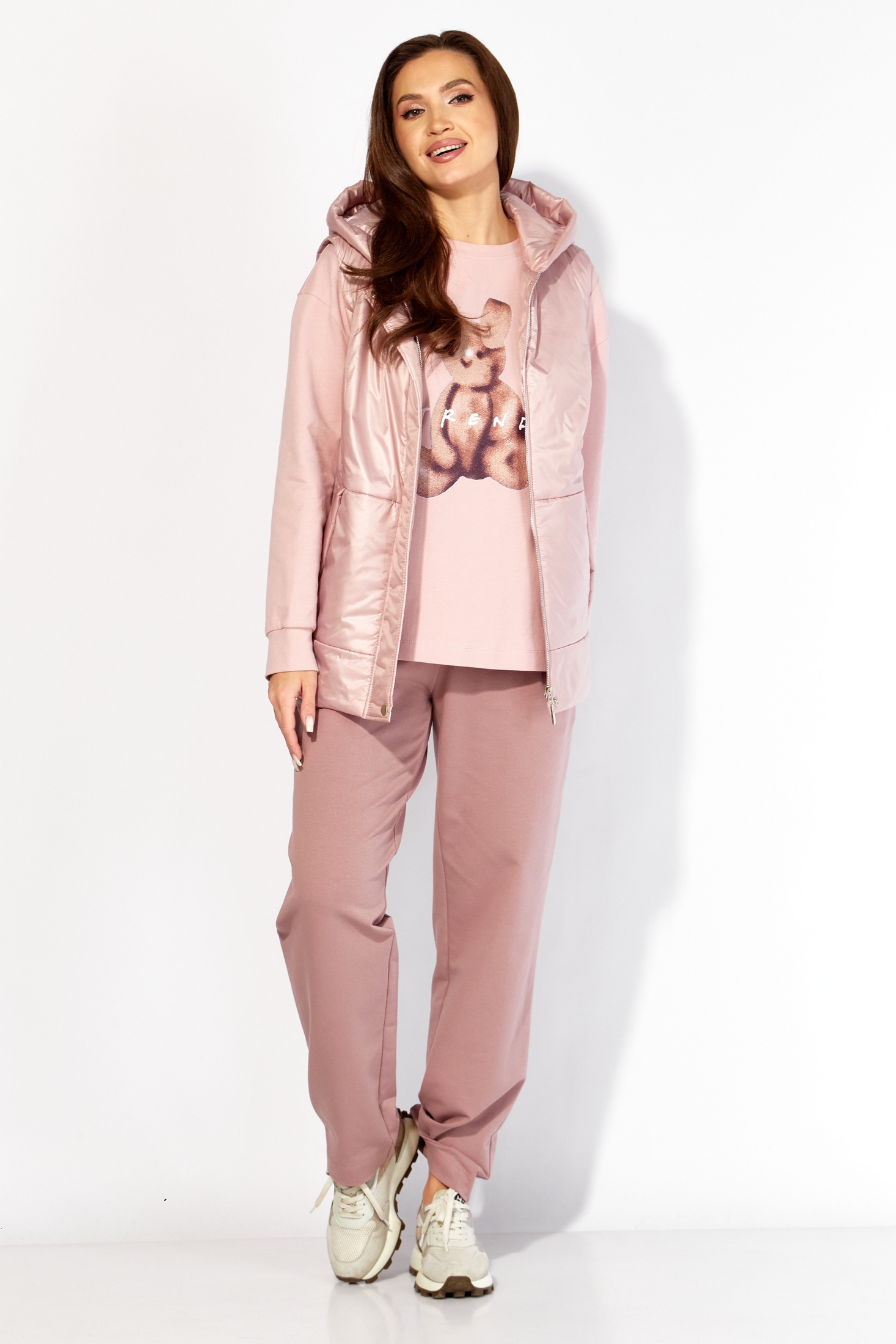 Костюм брючный 1417 розовый ТАиЕР - идеальный выбор для современного гардероба. Коллекция бренда ТАиЕР сочетает комфорт и стиль. Комплект состоит из свитшота, брюк и жилета, выполненных из трикотажного полотна, обеспечивая удобство в движении. Жилет из плащевки с капюшоном добавляет функциональности: молния с планкой на кнопках и карманы для практичности. Прямые брюки с поясом на резинке и карманами создают современный силуэт. Розовый цвет добавляет женственности, а принт на спинке и рельефы по переду делают образ уникальным. Подходит для весенне-осеннего сезона, обеспечивая легкость и теплоту при носке. Прекрасный выбор для повседневных и прогулочных образов.