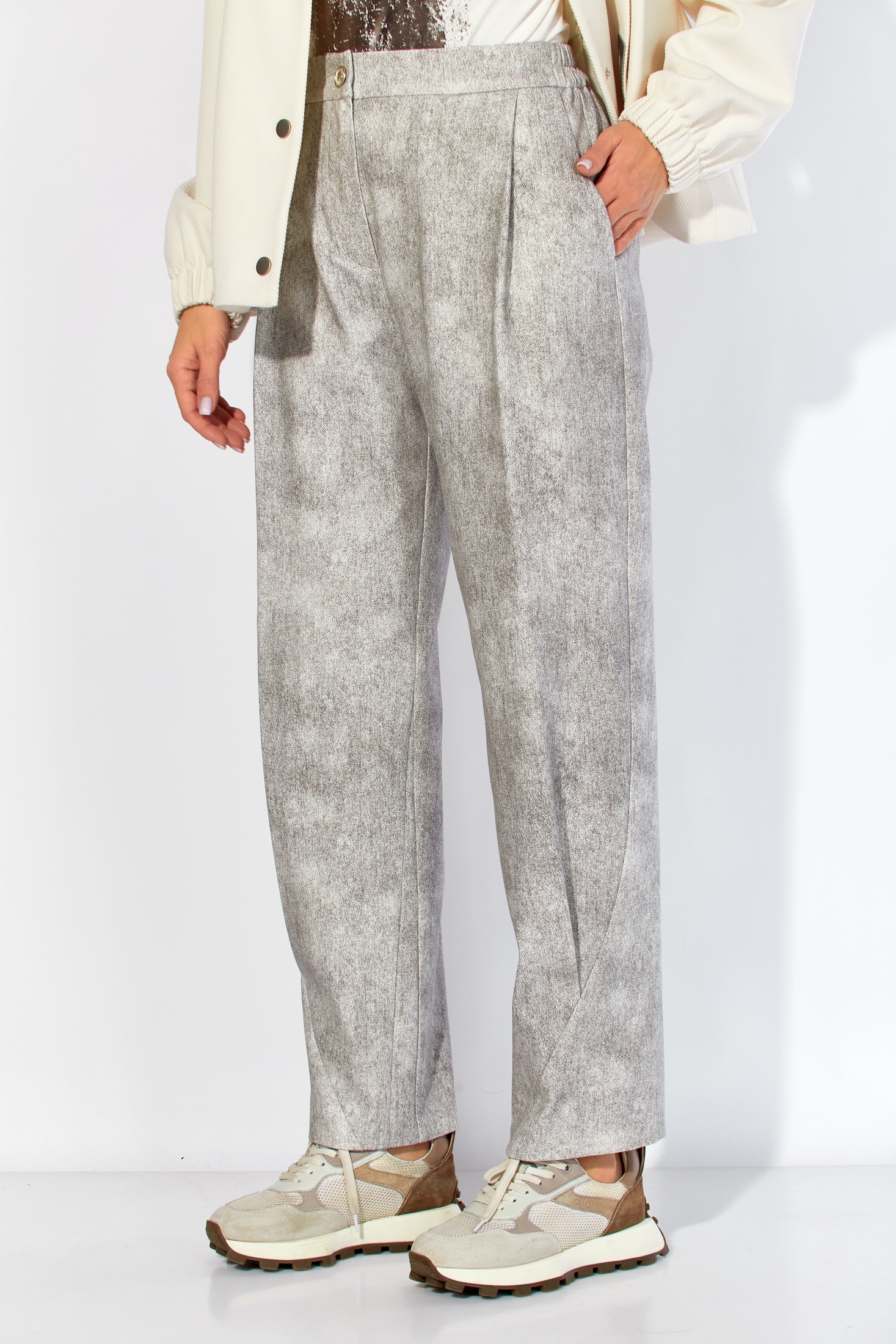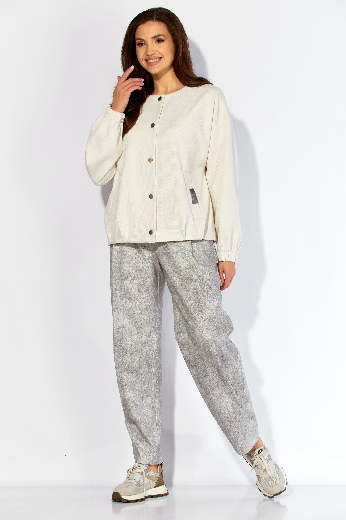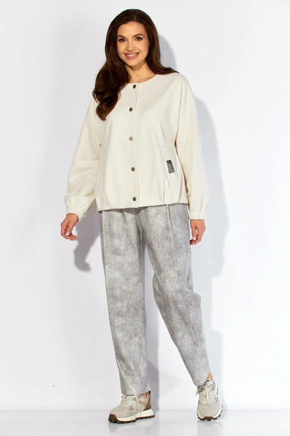 Костюм брючный 1426 ТАиЕРО — это стильный и удобный выбор для современного гардероба. Коллекция бренда ТАиЕРО предлагает женственный комплект из бомбера и брюк, выполненный в белых и серых тонах. Бомбер прямого силуэта с мягкими складками и центральной застежкой на кнопки дополняется карманами с отделкой. Брюки типа "бананов" придают образу дерзости и комфорта, благодаря резинке на поясе и застежке на молнию. Изготовленные из полиэстера и вискозы, костюм идеально подойдет для весеннего и осеннего периода. Этот комплект станет отличным дополнением как для повседневных прогулок, так и для более формальных мероприятий.