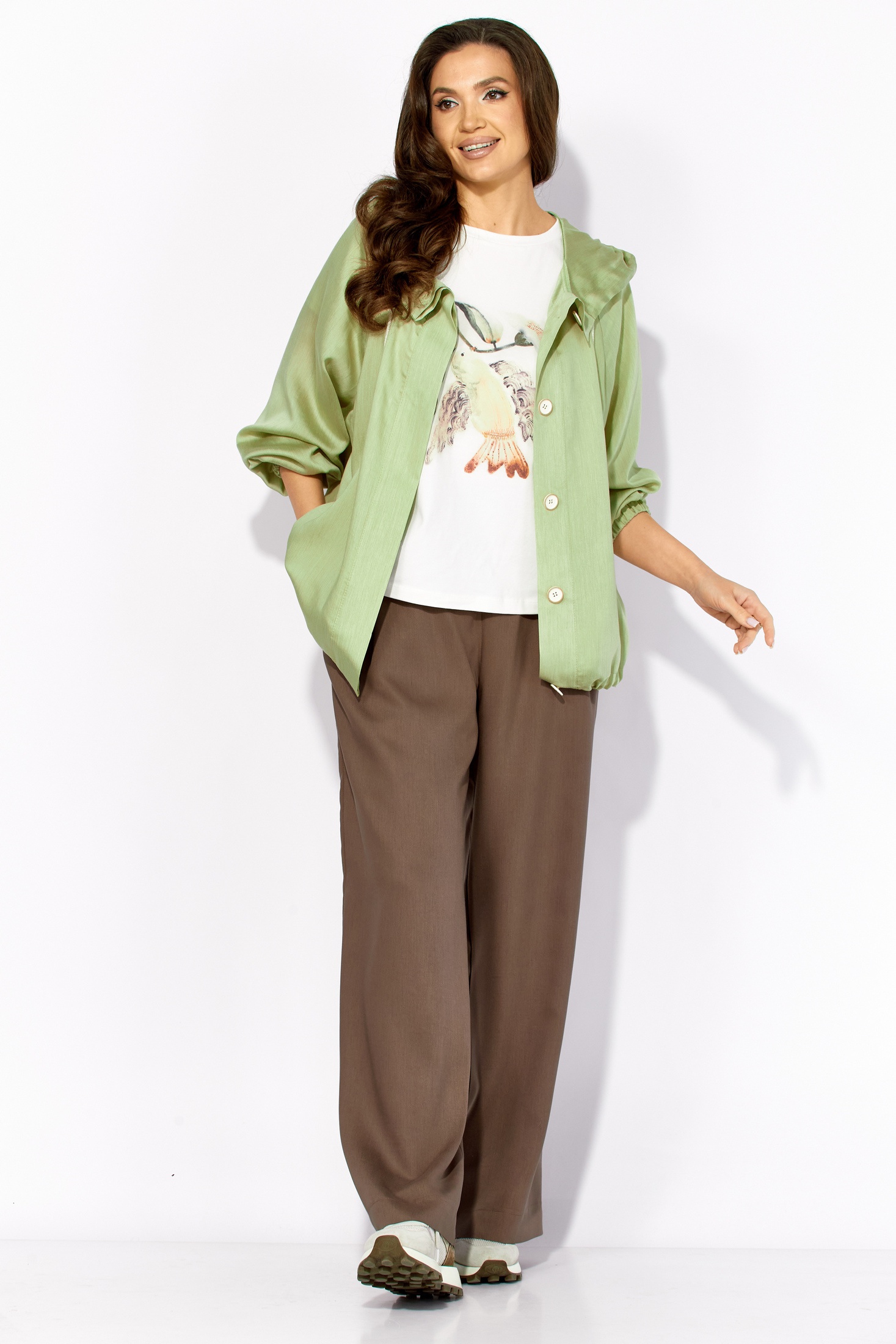Костюм брючный 1431 оливка+шоколад ТАиЕР — это стильный трёхкомпонентный комплект, состоящий из облегчённой куртки-парки, широких брюк и топа. Коллекция бренда ТАиЕР предлагает уникальное сочетание цветов оливковый и шоколадный. Куртка выполнена из вискозы, полиэстера и шерсти, имеет капюшон с кулисой, центральную потайную застёжку на петли и пуговицы и регулируется по нижнему краю. Брюки прямого фасона с наклонными карманами и эластичным поясом идеально подходят для прогулок в любое время года. Топ из трикотажного хлопка, с коротким рукавом и декоративным принтом, добавляет лёгкость и комфорт. Этот костюм станет отличным выбором для весеннего и летнего гардероба.