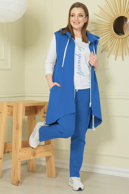 Мегауниверсальный женский комплект, состоящий из жилета, брюк и лонгслива. Жилет удлиненный А-силуэта, по низу по бокам разрезы, вставлена кулиска. Низ спинки чуть длиннее переда. По переду и спинке отрезные икокетки. Карманы в наклонных рельефах. Застежка спереди на металлическую тесьму "молния". Горловина жилета оформлена капюшоном. Спинка задекорирована оригинальной дизайнерской вышивкой в тон ткани. Брюки прямые, заужены к низу. Пояс притачной на резинке, спереди с завязкой из отделочной тесьмы. Спереди застрочены канты. Карманы наклонные спереди. Лонгслив прямого силуэта длиной до линии бедер, декорирован флоковой печатью спереди, рукав 3/4. Горловина круглой формы, оформлена бейкой с перекрутом, Длина брюк-102 см см, Длина жилета по спинке-99 см см. Длина лонгслива-69 см.