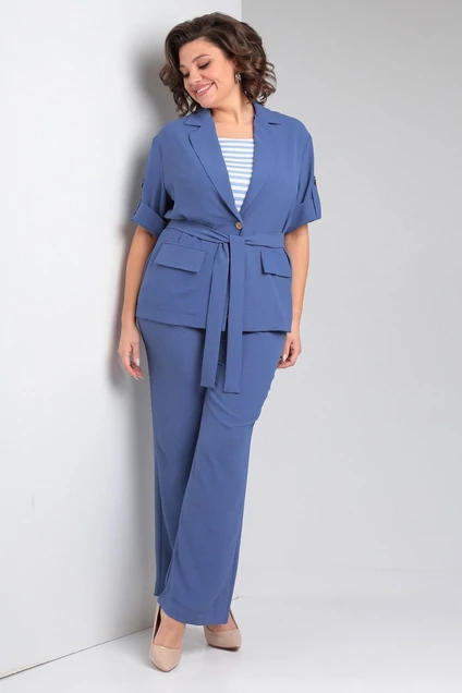 Комплект состоит из жакета, брюк и блузы. Жакет без подкладки из костюмной ткани свободного силуэта, со съемным поясом, слегка спущенной линией плеча, коротким рукавом, лацканами, отложным воротником, центральной бортовой застежкой на петли и пуговицы. Перед с клапанами. Рукав втачной одношовный, с обтачкой и патой с застежкой на петли и пуговицы. Длина по спинке 70. Длина рукава 25 Брюки из костюмной ткани свободного силуэта, прямые с карманами в боковых швах, на поясе с резинкой. Длина 103