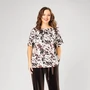 Костюм двух предметный состоящий из жакета и брюк. Жакет на подкладке полуприлегающего силуэта с застежкой на петлю и пуговицу, по переду обработаны прорезные карманы с клапаном, рельефные швы, слева в верхней часли листочка и декоративный сьемный цветок. Спинка со средним швом, рельефами и шлицей. Рукав втачной, двухшовный, по локтевому швау расположены шлицы с застежкой на три пуговиц. Брюки прямые на поясе, застежка на пуговицу и тесьму молнию, с боковыми карманами. Длина жакета 66см, длина рукава 61см, длина брюк с учетом пояса 110см.
