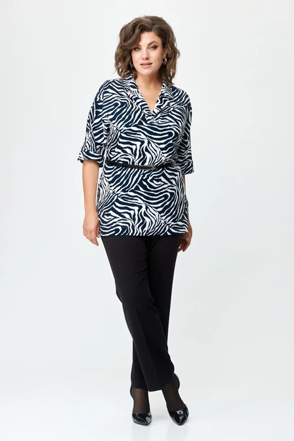 Блуза из плотной непрозрачной принтованной ткани. Горловина с воротником, переходящим в планку. Силуэт свободный. Рукав цельнокроеный , длина 3/4, с отложной манжетой по низу. По бокам невысокие разрезы. Пояс из эко-кожи подчеркнет талию. Длина блузки по спинке 73 см Длина рукава от плеча 48 см
