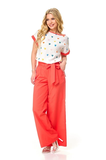 Летний «романтичный» брючный комплект из воздушного муслина «сердце» и тонкой брючной ткани со съемным поясом. Цвет яркий, сочный.