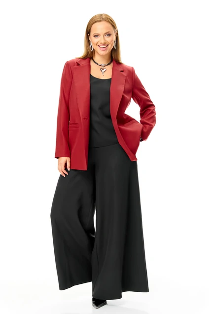 Яркий стильный жакет на жаккардовой подкладке в комплекте струящихся черных брюк и блузы.