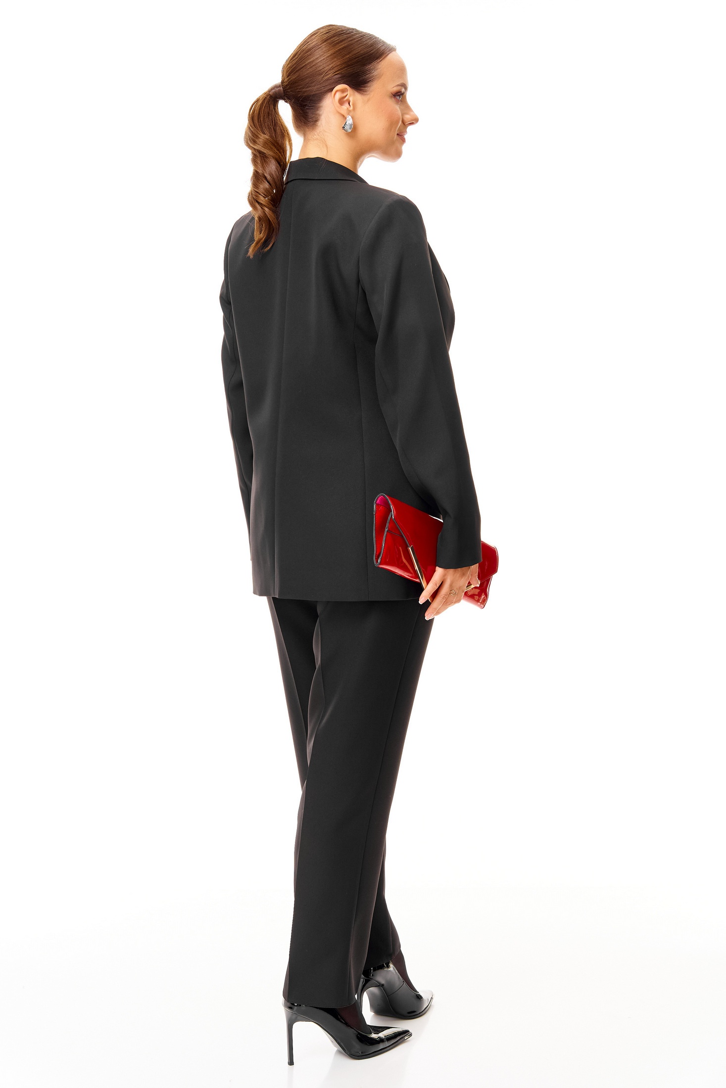 Свободный жакет с воротником и лацканами, застегивается на петли и пуговицы, с прорезными карманами по переду. Рукав длинный. Жакет по переду и спинке на подкладке.