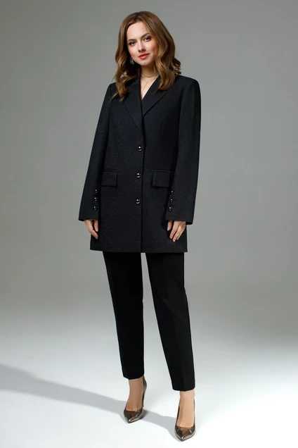Костюм-двойка из жакета и брюк. Удлиненный жакет прямого кроя со смещенной застежкой на пуговицы. Пиджачный воротник, карманы с клапанами. Рукав втачной с декоративными пуговицами спереди. Сзади жакет со шлицей. Брюки прямые с высокой посадкой, с заутюженными складками, зауженные к низу. На передней половине наклонных карманов с листочками. Вверху брюки на притачном поясе, по бокам вставлена резинка, застежка на «молнию» и пуговицу.