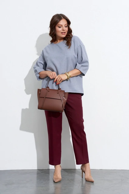 Блуза объёмная, прямого силуэта, с мягкой линией плеча и рукавами в ¾ длины. Низ переда и спинки фигурный, разной длины. Горловина округлая, на спинке обработана короткая металлическая молния. Низ рукавов со складками.