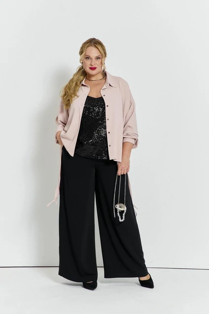 Прямые, широкие брюки с карманами спереди и на поясе с резинкой.