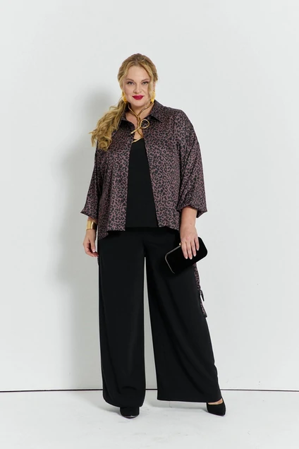 Объёмная блуза с мягкой линией плеча, рубашечным воротником на отрезной стойке, с кулисой по низу спинки. Застёжка на пуговицы, рукава на манжетах без застёжки.
