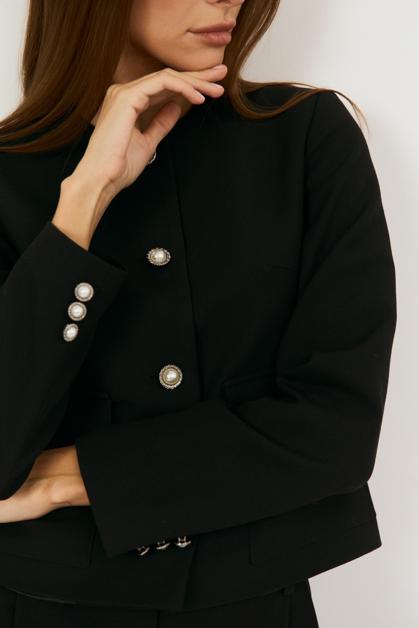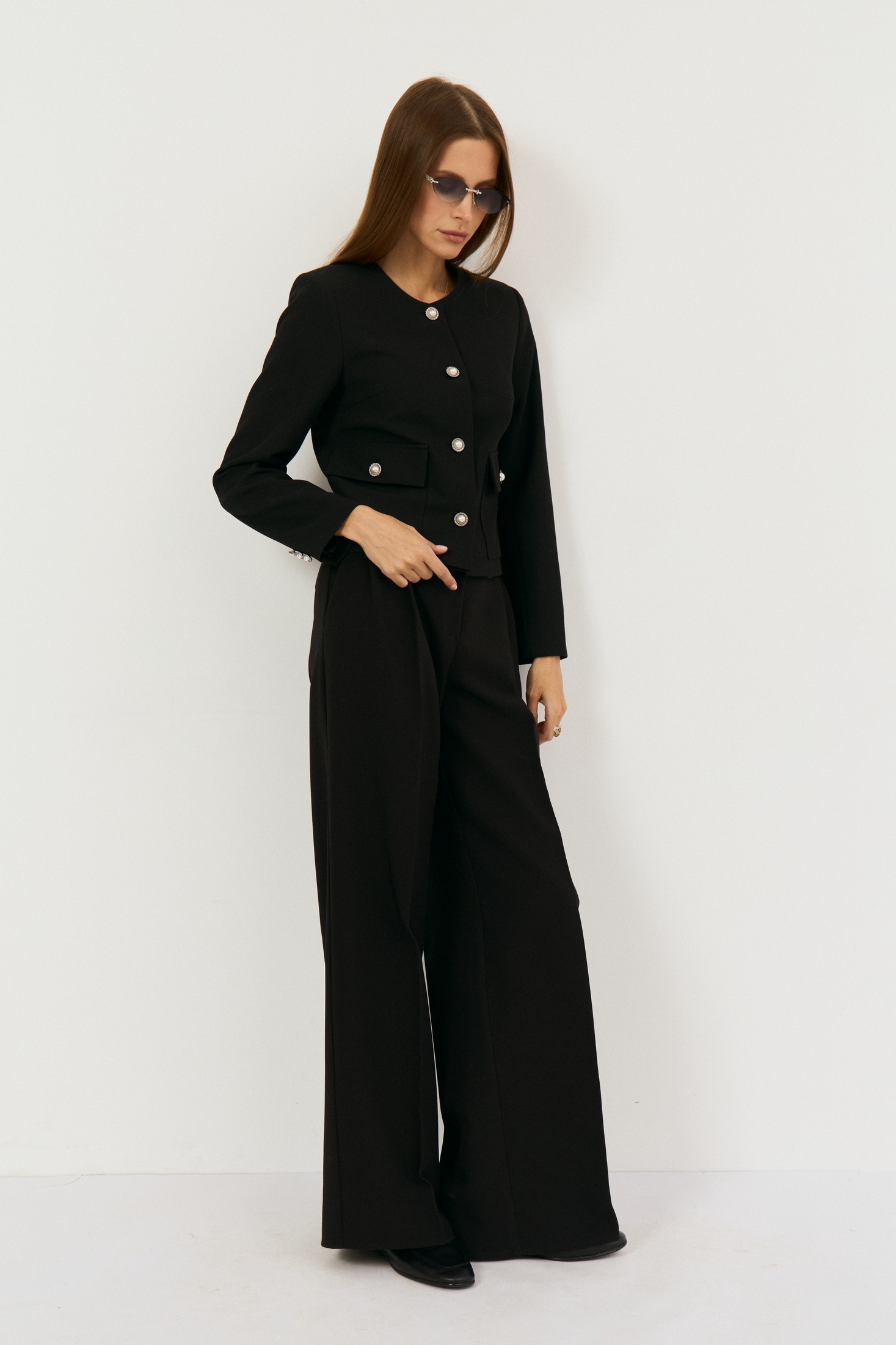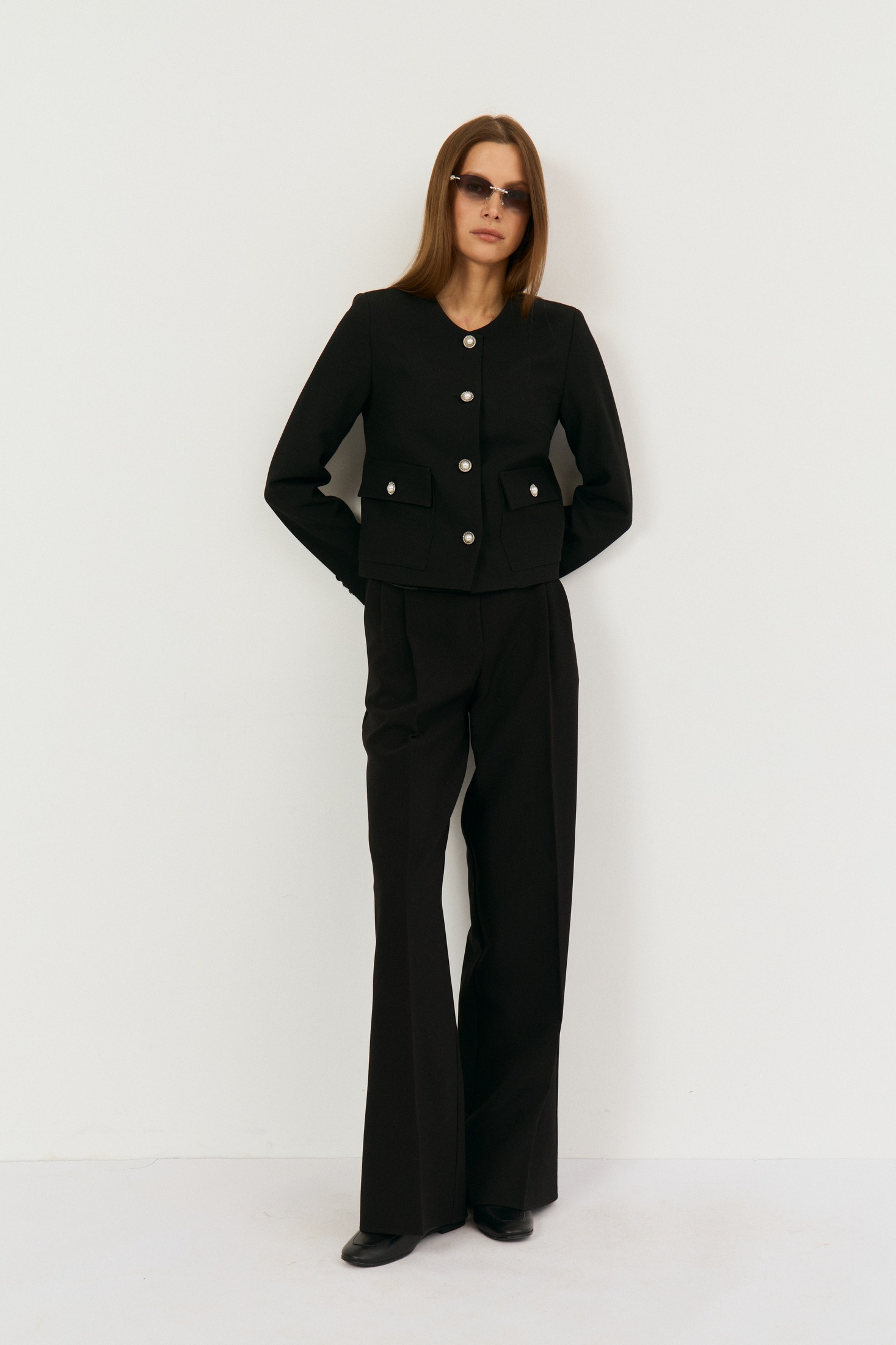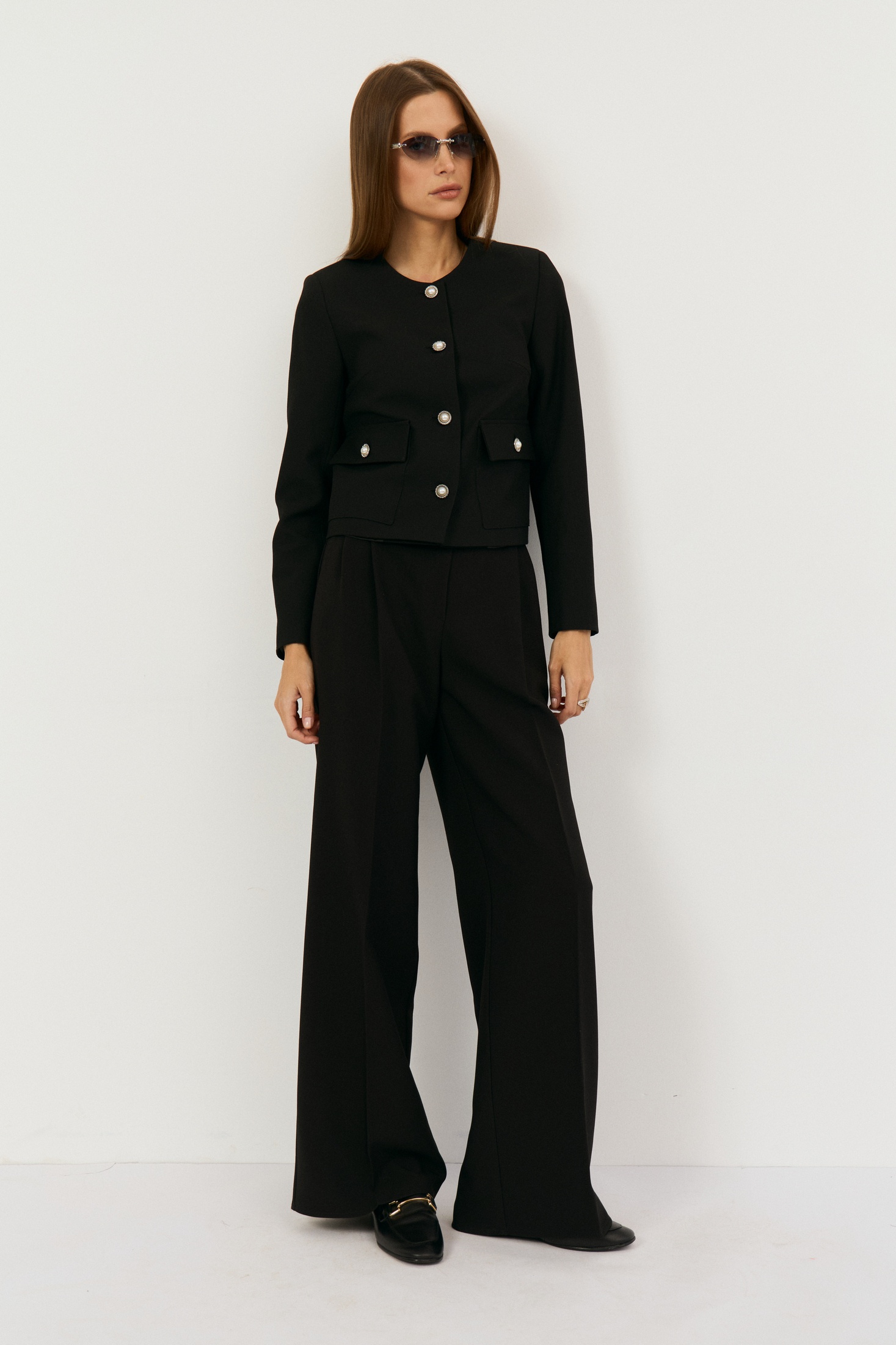 Костюм брючный 2505 черный The name — элегантное сочетание стиля и функциональности. Коллекция бренда The name предлагает подходящий выбор для делового или классического гардероба. Укороченный жакет прямого силуэта выполнен с круглым вырезом без воротника и дополнен функциональными накладными карманами с застежкой на петлю-пуговицу. Брюки прямого кроя с защипами спереди и застежкой-молнией идеально дополняют комплект. Основной материал — костюмная ткань, содержащая полиэстер, вискозу и спандекс, что обеспечивает комфорт и эластичность. Жакет идет с центральной однобортной застежкой, а подкладывая элемент конструкций выполнен из полиэстера и вискозы, что обеспечивает удобство носки. Длина по спинке — 50 см, длина рукава — 61 см, длина брюк по боковому шву — 110 см. Черный цвет и лаконичный дизайн делают этот комплект универсальным выбором для офиса.