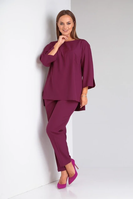Комплект женский выполнен из плательно-костюмной однотонной ткани, состоит из брюк и блузона. Брюки слегка зауженные к низу на притачном поясе с резинкой. В боковых швах имеются функциональные карманы. Блузон свободного покроя, по спинке средний шов с застёжкой сверху на потайную молнию. По переду вышивка. В боковых швах блузона разрезы, спинка длиннее переда на 8 см. Горловина округлой формы. Рукав двухшовный 3/4 по низу разрез.