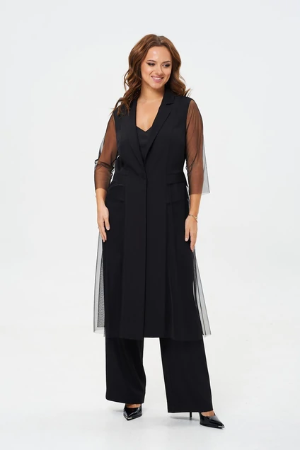 Комплект женский нарядный трехмпердметный: накидка, брюки и топ. Накидка полуприлегающего силуэта, лиф и центральная часть переда выполнены из плательно-костюмной ткани, рукав и нижняя часть накидки из сетки. По переду центральная застежка на петлю и пуговицу, вертикальные рельефы от плеча. Воротник с лацканом пиджачного типа. Топ на бретелях из отделочной ткани атлас. Брюки прямого силуэта на поясе с резинкой, свободного покроя, в боковых швах функциональные карманы.
