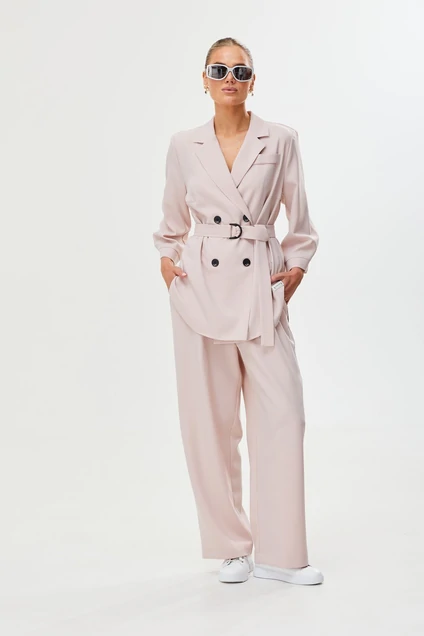 Костюм женский двухпредметный от белорусского производителя превратит Ваш образ в идеал стиля и элегантности. В нем Вы будете чувствовать себя комфортно в теплую погоду. Широкий крой штанов и свободный пиджак сделают модель незаменимой в летнем гардеробе модниц. Насыщенный жемчужный оттенок идеально сочетается с классическими цветами. Комплект от белорусского производителя можно комбинировать с разной обувью и аксессуарами.
