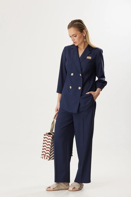 Двухпредметный костюм состоит из жакета и брюк. Модель выполнена из льна вишера. Двубортный жакет без подкладки дополнен втачным рукавом ¾, с манжетой по низу, которая застегивается на петлю-пуговицу.