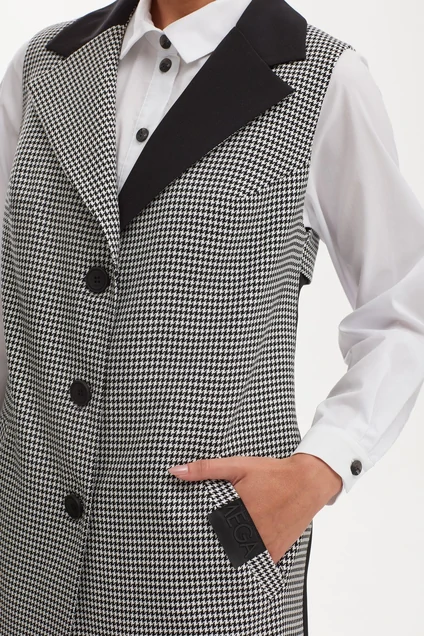 легантный и стильный женский модный костюм поражает своей изысканностью и неповторимым стилем. Основой этого образа является удлиненный жилет, который подчеркивает женскую фигуру и придает образу изысканности, узор гусиная лапка добавляют дополнительную изюминку и оригинальность этому наряду. Сочетание классического кроя и современного дизайна делает этот костюм идеальным выбором для деловых встреч, вечеринок или других мероприятий, где важно выглядеть стильно и элегантно.