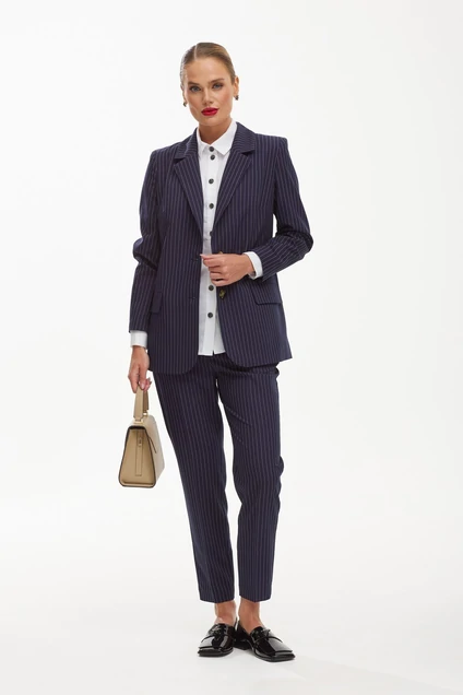 Данный комплект сшит из высококачественной ткани темно-синего цвета, в полоску. Жакет удлиненный, прямого кроя, прикрывающий линию бедра. Он отлично корректирует фигуру, зрительно добавляя рост и грациозность внешнему виду. Брюки классического фасона, с завышенной талией. Сзади для удобства и комфорта вставлена резинка. Данная модель будет отлично сочетаться с обувью на каблуке, делая образ элегантным. Для более формальных мероприятии и повседневных образов можно сочетать с более комфортной обувью, без каблука.