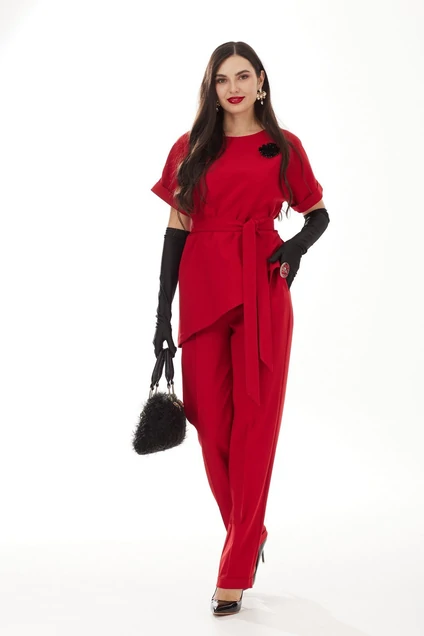 Костюм женский, выполненный из ткани костюмной группы, состоящий из блузы и брюк.