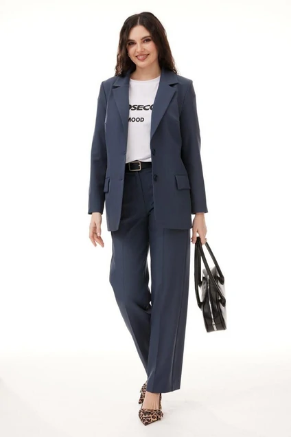 Костюм 3-х предметный, состоящий из жакета, брюк и футболки. Жакет и брюки выполнены из костюмной поливискозы, футболка выполнена из хлопкового трикотажа. Жакет выполнен на контрастной подкладке из поливискозы. Жакет прямого силуэта с намеком на полуприлегание, с застежкой на две петли-пуговицы. Горловина оформлена воротником пиджачного типа, рукава двушовные втачные. Спинка жакета со средним швом. Перед жакета с рельефами, нагрудными вытачками и прорезными карманами с клапаном. Длина жакета - до середины бедра. Брюки классической формы, прямого силуэта, со стрелками по передним и задним половинкам. Верхний срез обработан обтачным поясом. На задних половинках расположны талевые вытачки, и настрочены декоративные листочки. В боковых швах брюк обработаны наклонные карманы. Застёжка центральная на тесьму молнию и крючок. В комплект входит съёмный ремень. Футболка прямого силуэта, с втачным рукавом с цельнокроеной манжетой. Горловина обработана обтачкой.