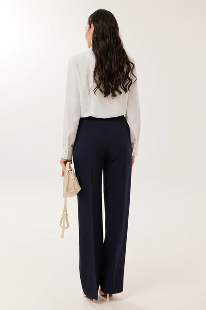 Комплект из двух предметов: блуза и брюки. Блуза женская жакетного типа, полуприлегающего силуэта, выполнена из струящейся поливискозы. Блуза с центральной застёжкой на петли и пуговицы. Горловина оформлена воротником пиджачного типа. Правая деталь переда блузы с нагрудной выточкой, левая - с вертикальным рельефом и подрезом, в области груди обработана декоративная листочка. Спинка цельнокроенная с талиевыми выточками. Рукав втачной длинный, низ рукава обработан притачной манжетой, которая застёгивается на 2 петли и пуговицы. Брюки классической формы, прямого силуэта, со стрелками по передним и задним половинкам. Верхний срез обработан обтачным поясом, дополнен практичными шлевками для ремня. На задних половинках расположены талиевые вытачки с настрочными декоративными листочками. В боковых швах брюк обработаны наклонные карманы. Застёжка центральная на тесьму-молнию и крючок. Брюки комплектуются ремнем.