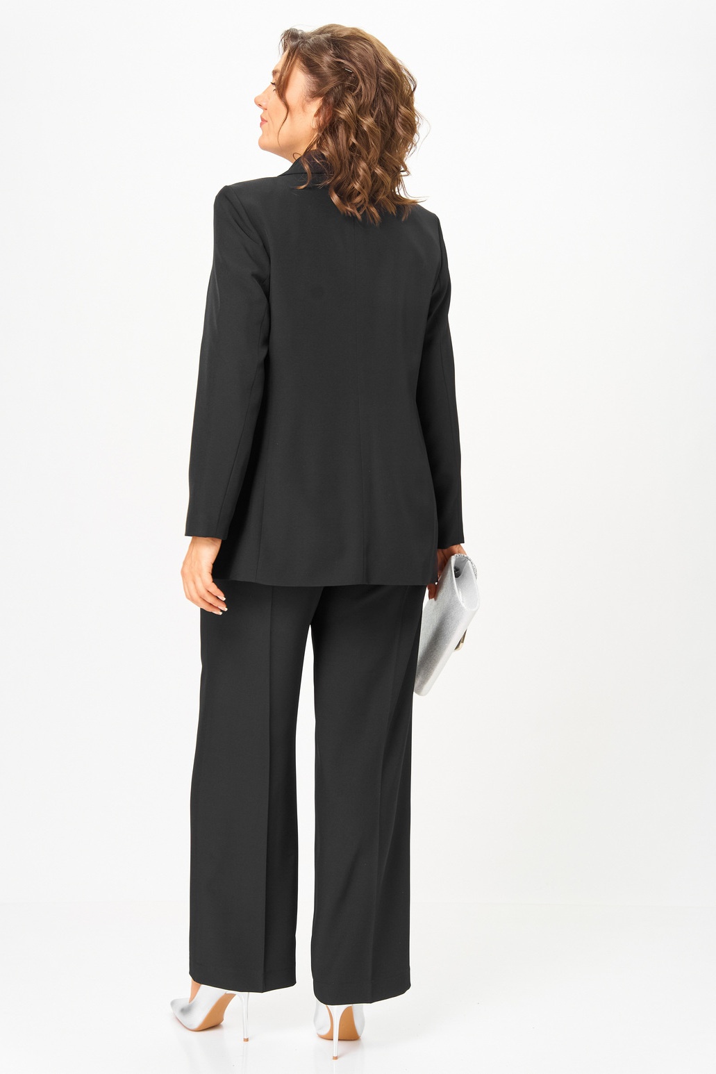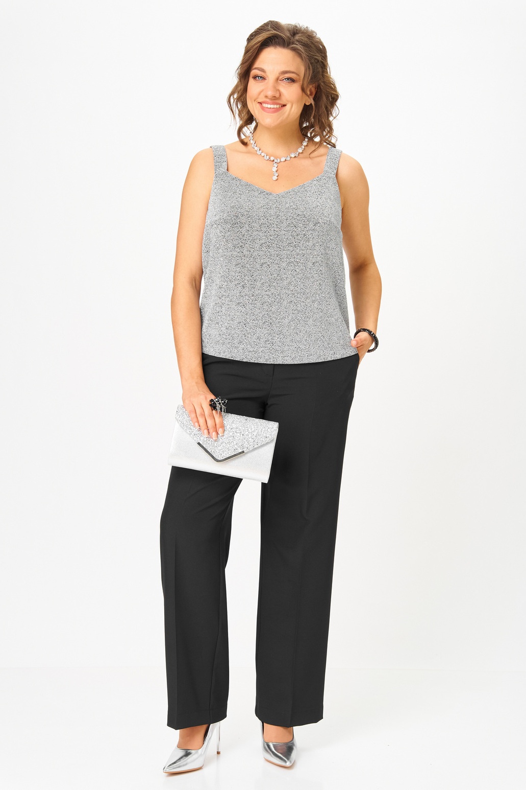Комплект женский 3-х предметный, состоящий из жакета, топа и брюк. Жакет прямого силуэта, с застежкой на две петли и две пуговицы, на контрастной подкладке из поливискозы. Перед жакета с нагрудными вытачками и прорезными карманами с клапаном. Спинка жакета со средним швом. Рукава двухшовные втачные. Горловина оформлена воротником пиджачного типа. Брюки классической формы, прямого силуэта, со стрелками по передним и задним половинкам. Верхний срез обработан обтачным поясом. В боковых швах брюк обработаны наклонные карманы. Застёжка центральная на тесьму-молнию и крючок. В модели использована фурнитура контрастного цвета. Топ прямого силуэта на широких бретелях, выполнен из трикотажного полотна с люрексом. Перед с нагрудными вытачками. Горловина переда лёгкой V-образной формы. Спинка цельнокроеная.