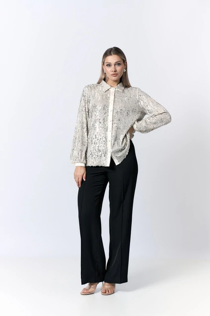 Комплект состоящий из рубашки и брюк. Рубашка прямого силуэта. Воротник на стойке. Рукав втачной,на манжете. Застегивается на петлю-пуговицу. По переду планка из отделочной ткани,которая застегивается на петли-пуговицы.