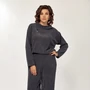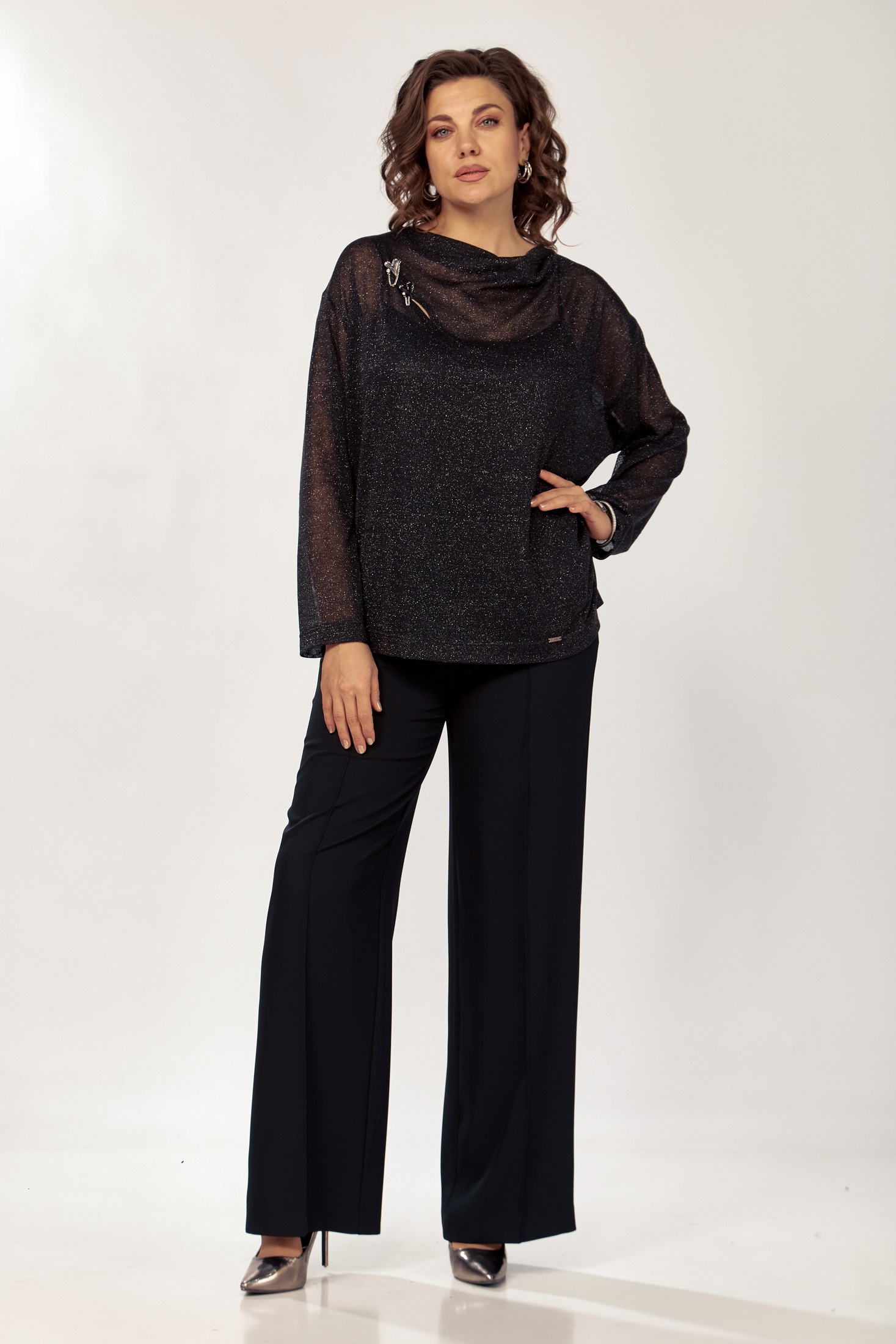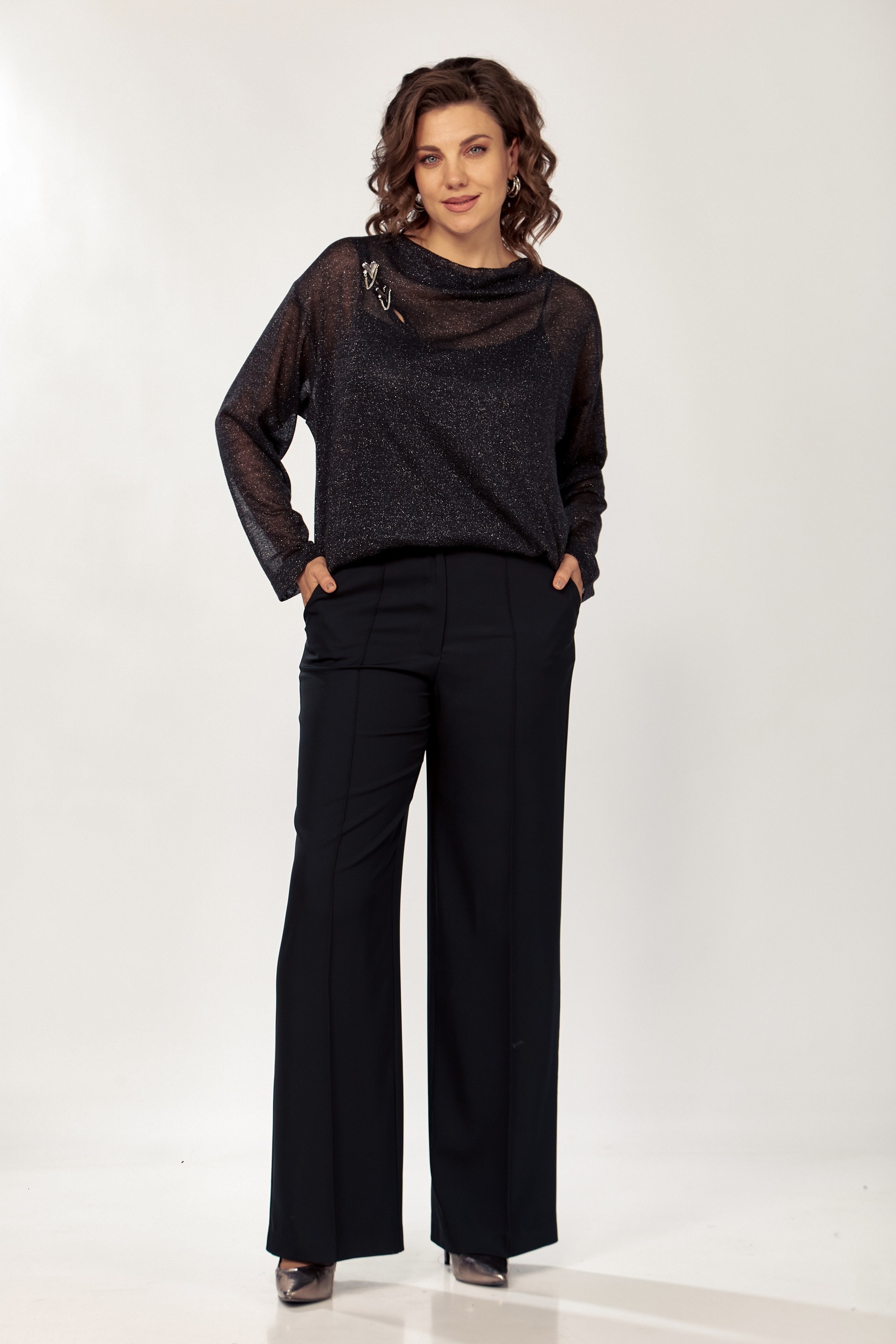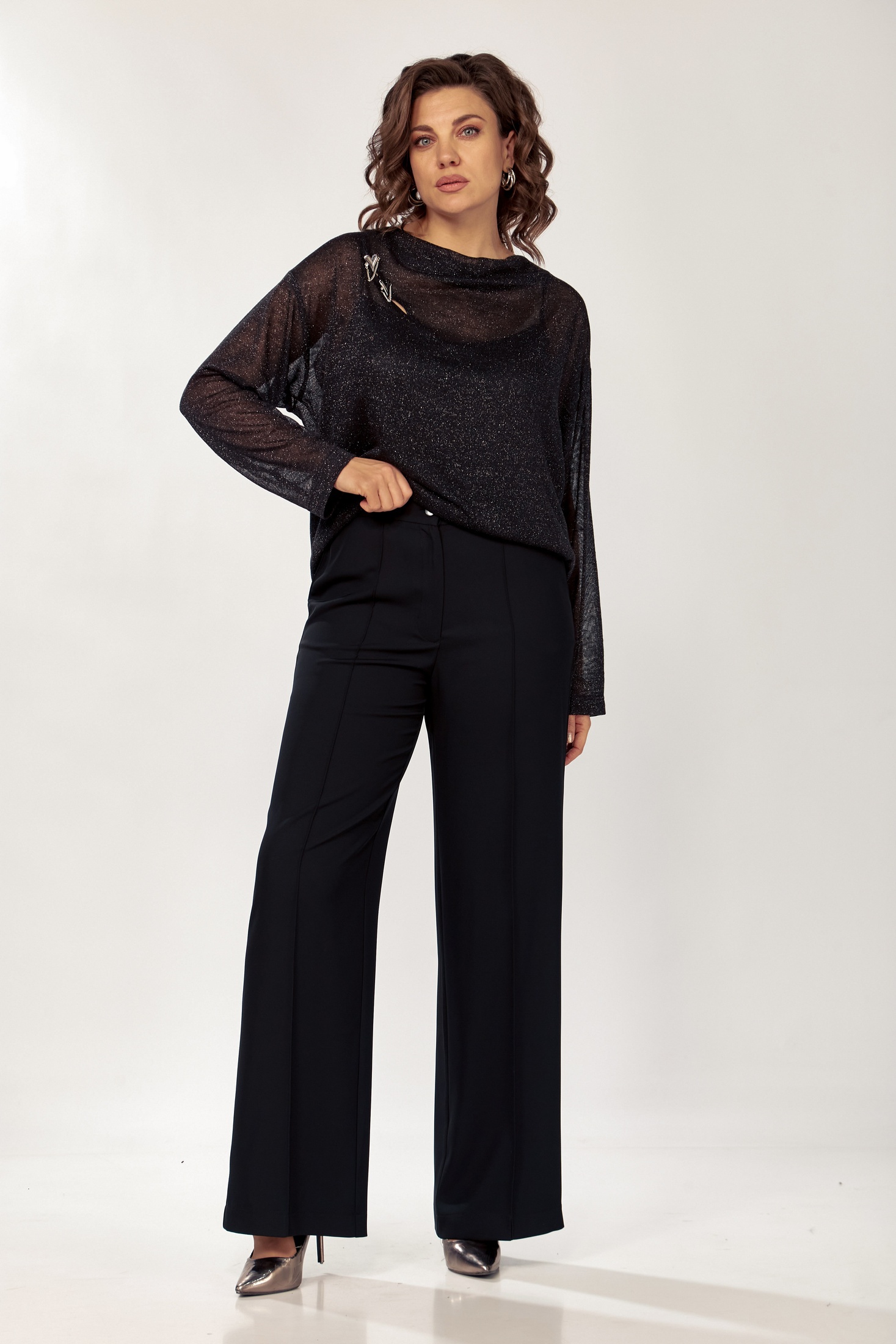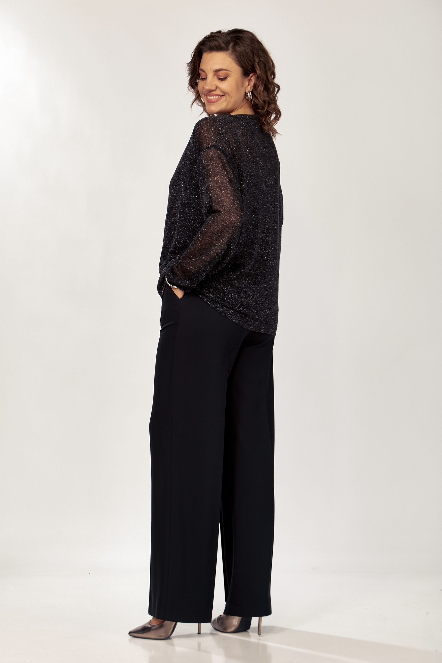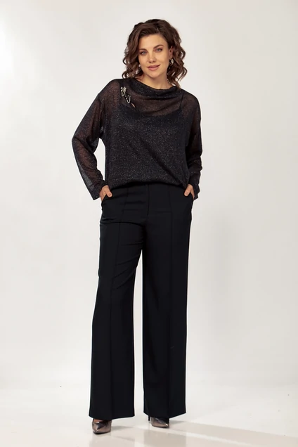 Комплект двойка состоит из блузы и брюк. Блуза свободного кроя.Рукав спущенный. Выполнена из прозрачной,вязаной ткани с люрексом. Горловина округлая “качель” По переду изделия подрез с декоративными разрезами и украшением в виде сердечек. По спинке средний шов.