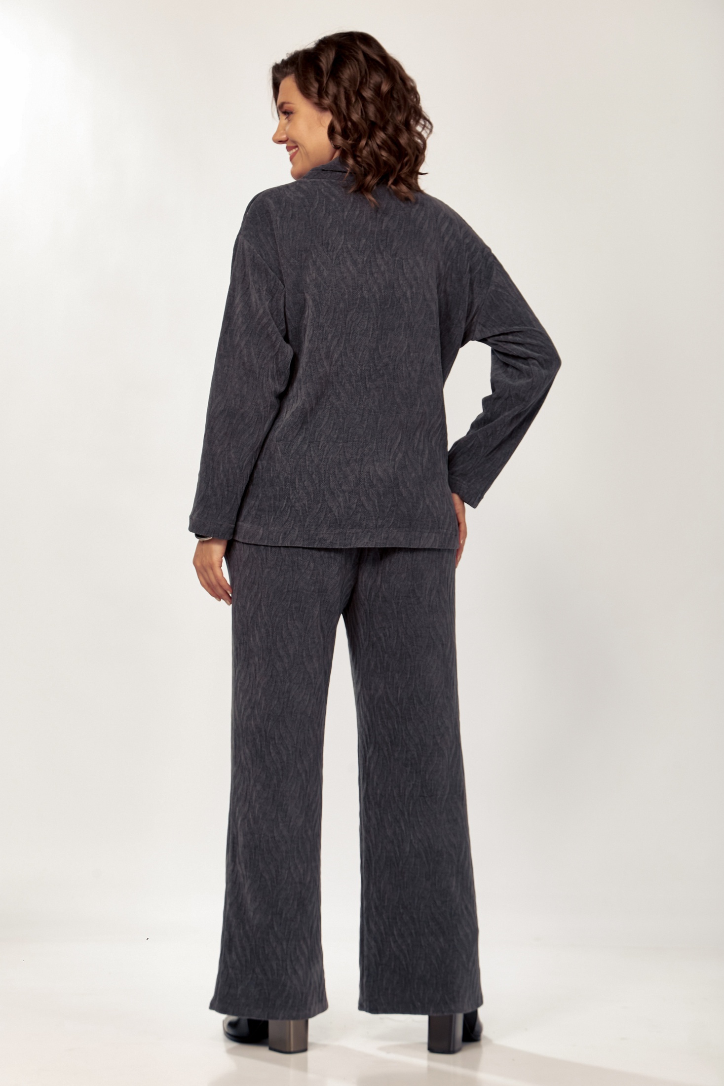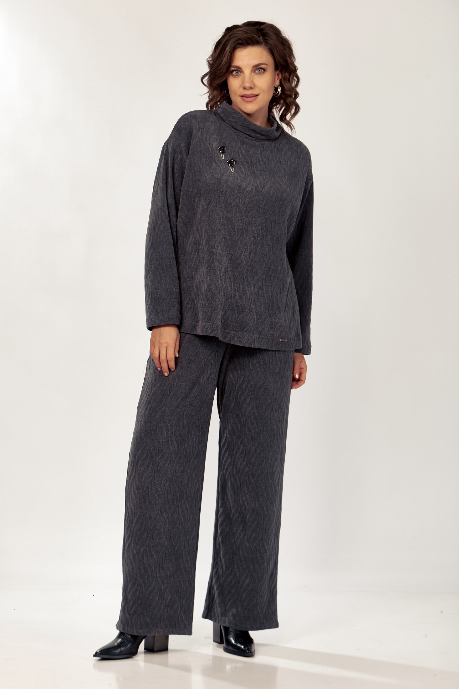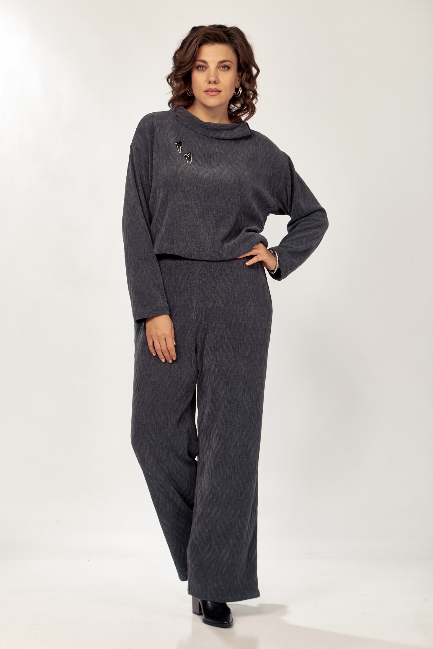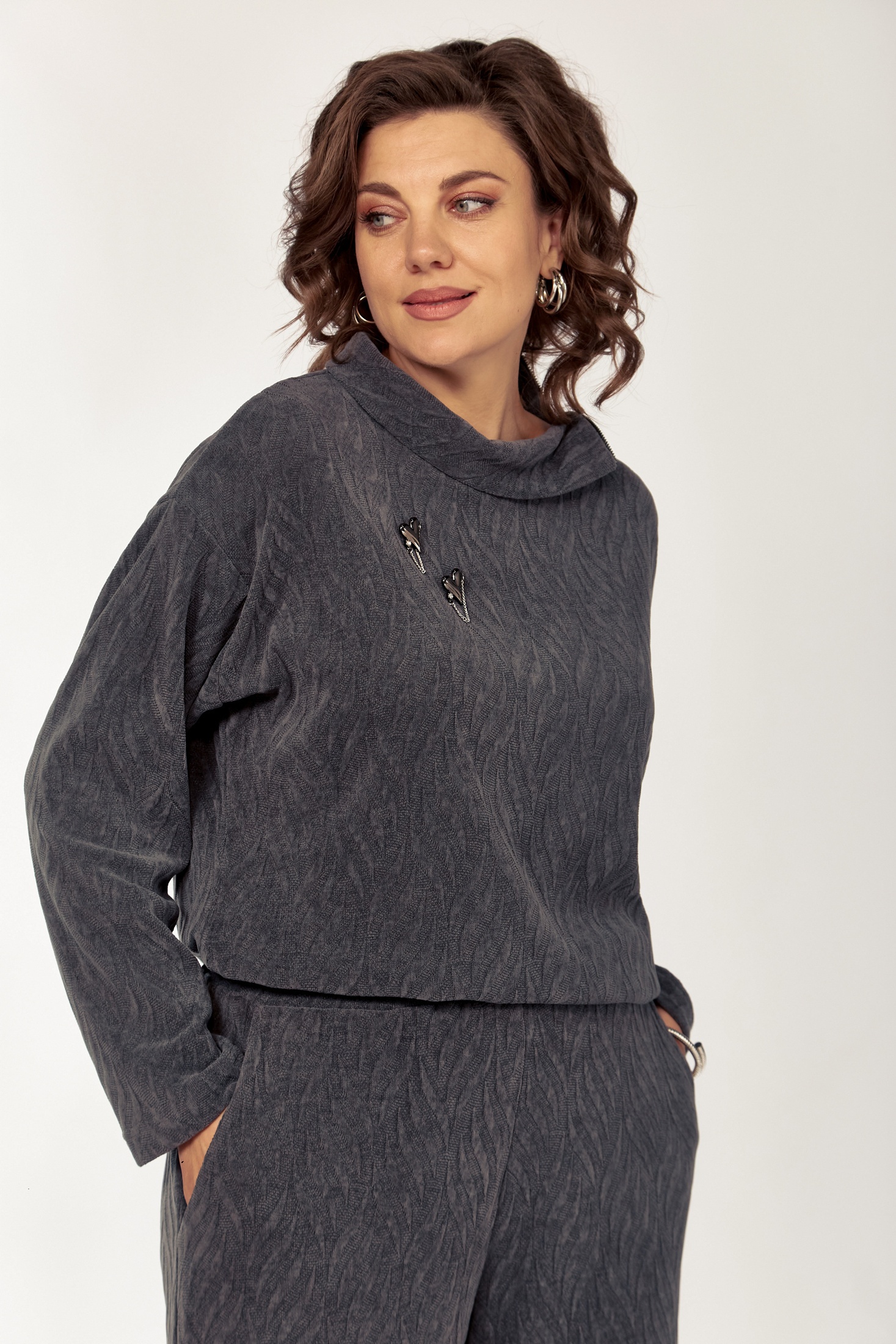 Комплект женской одежды, состоящий из джемпера и брюк. Оформлен в тонком трикотаже серого цвета с текстурным абстрактным узором. Джемпер свободного силуэта обогащен элементами функциональности и стиля: наличием молнии, переходящей с воротника-стойки на плечо, и спущенной линией плеча, что добавляет изделию современный вид. Прямые брюки дополнены удобным эластичным поясом и вшитыми боковыми карманами. Этот костюм подойдет как для повседневной носки, так и для создания расслабленных деловых образов.