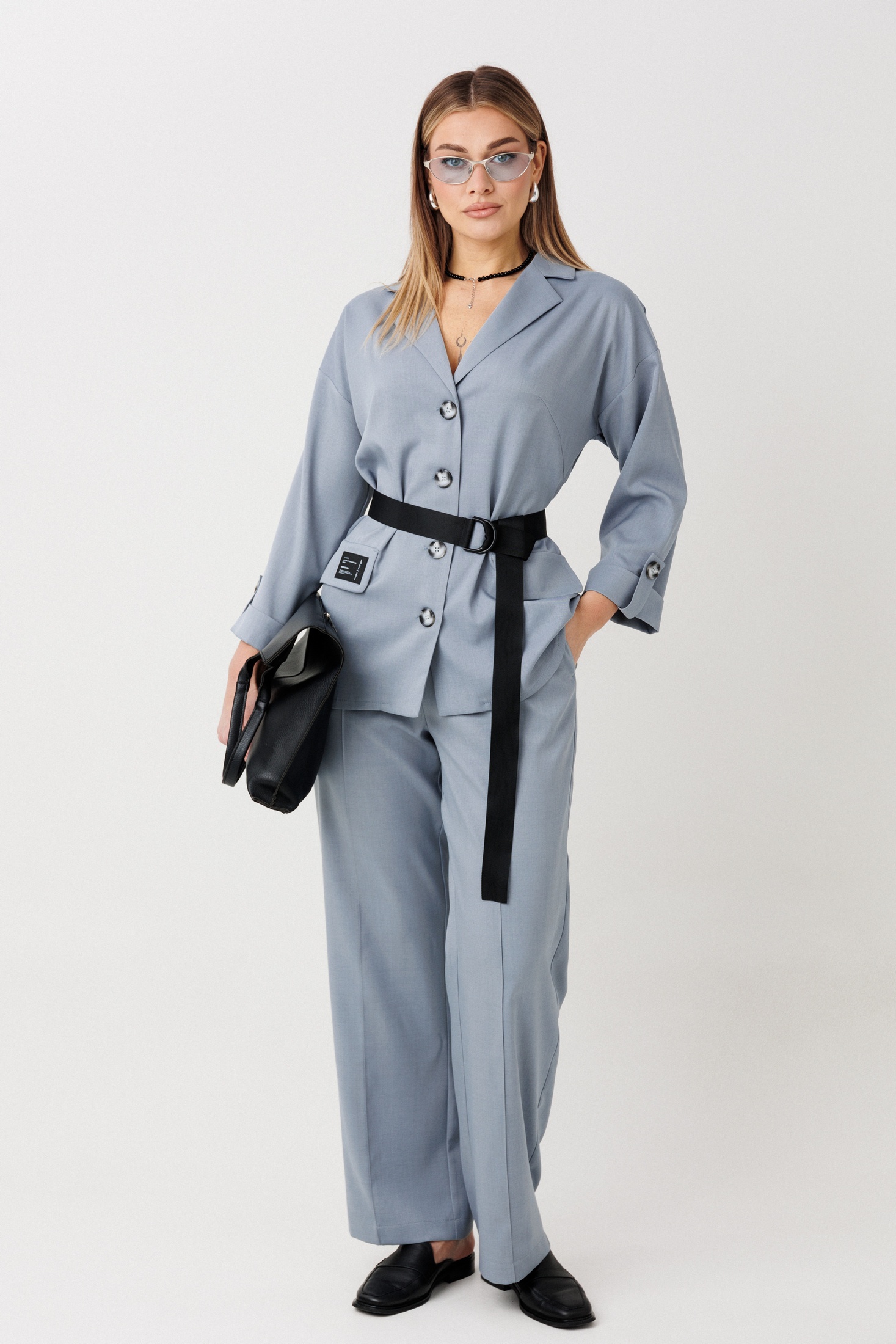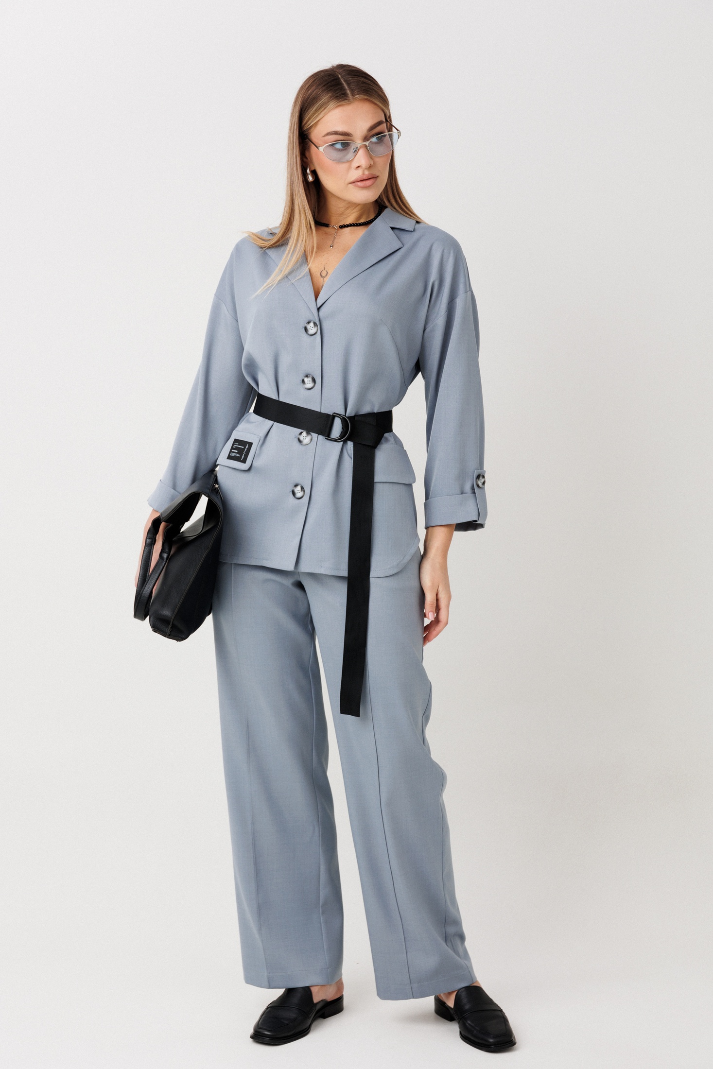 Костюм брючный 2443 серо-голубой VeritaModa — это идеальный выбор для стильного офисного гардероба. Коллекция бренда VeritaModa сочетает в себе элегантность и комфорт. Комплект двойка включает свободного кроя жакет с декоративными клапанами и классические прямые брюки. Жакет выполнен из мягкой вискозы с добавлением полиэстера и спандекса, что обеспечивает комфорт и посадку. Спущенные рукава и манжеты на пату придают образу легкость и непринужденность. Брюки на резинке в поясе обеспечивают дополнительное удобство. Серо-голубой цвет подходит для любого сезона и подчеркивает стильный вид костюма. В наличии декоративный пояс, который акцентирует талию. Этот костюм станет универсальным решением как для деловых встреч, так и для повседневного использования.