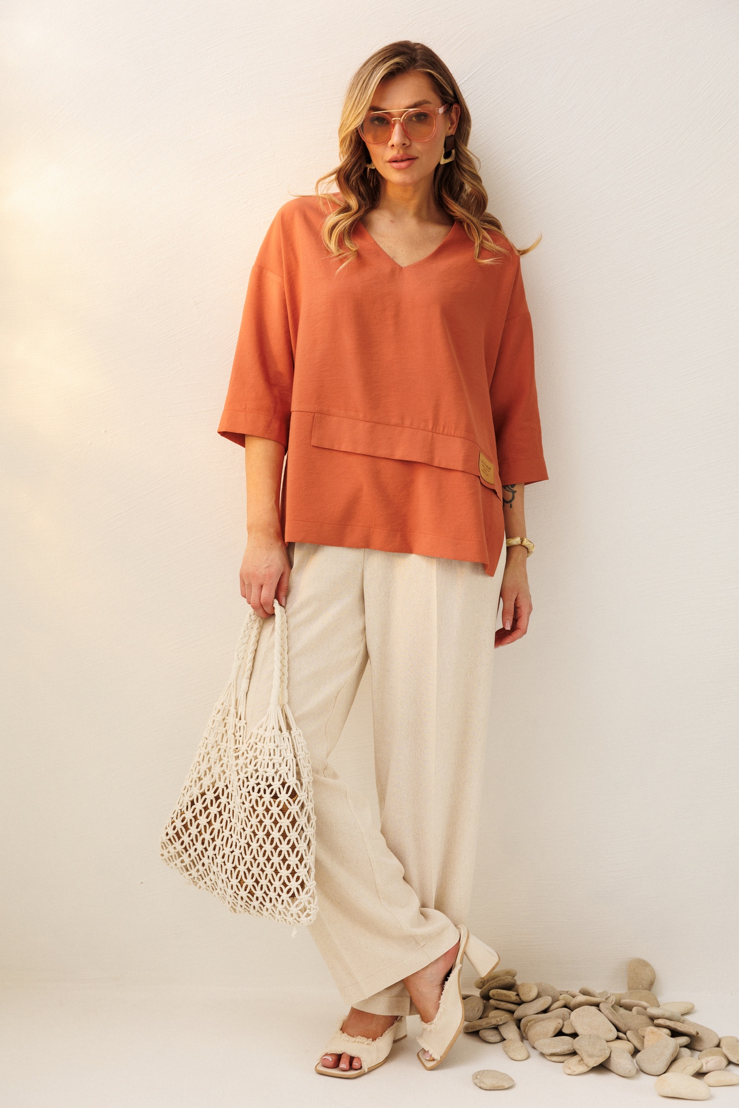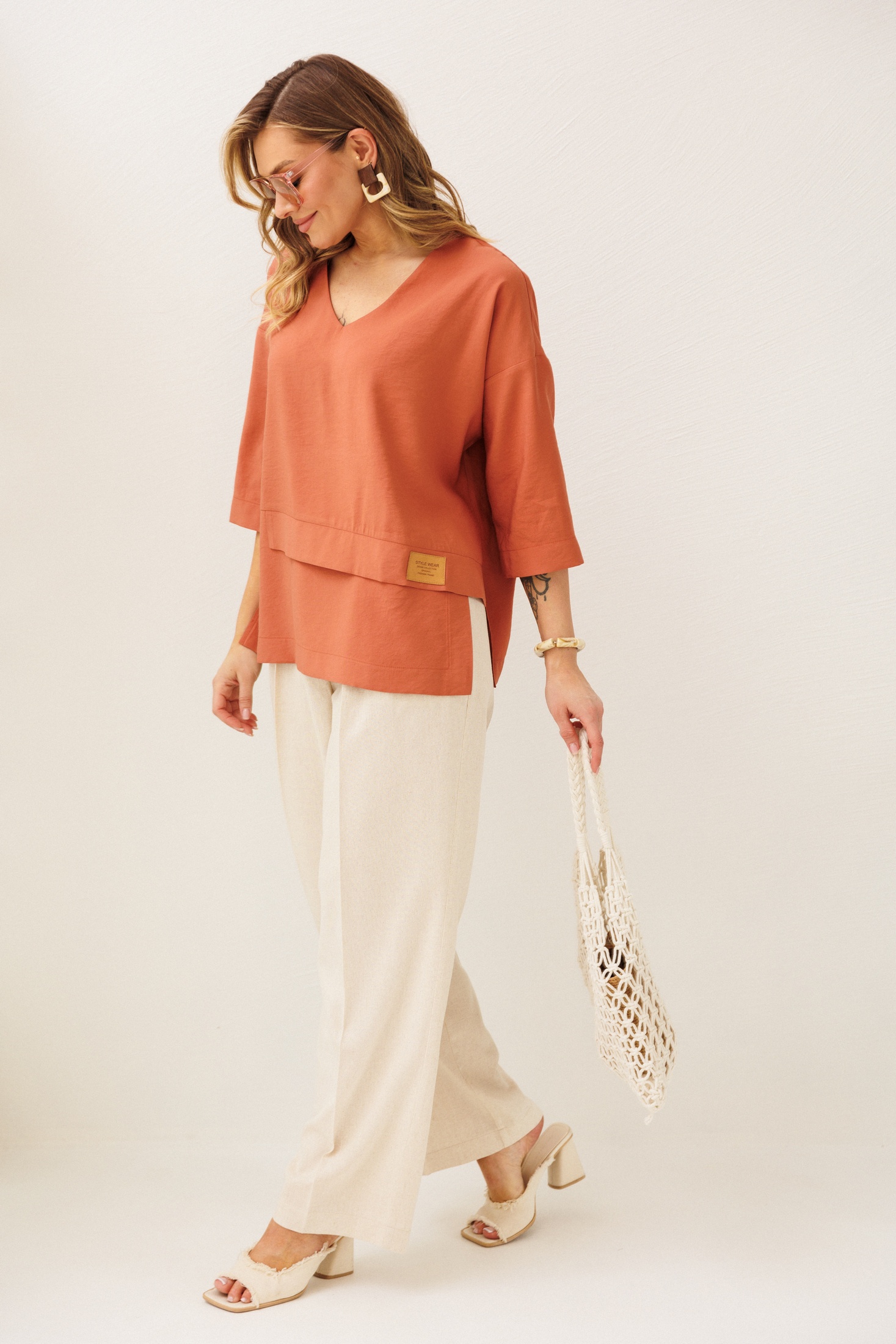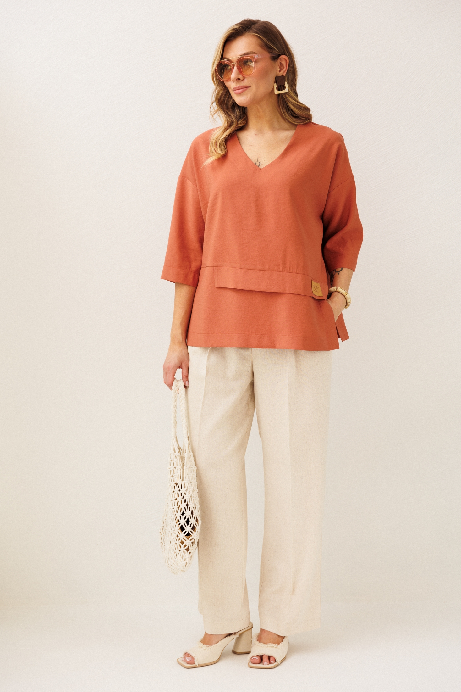 Костюм брючный 2465 VeritaModa — идеальный выбор для ценителей комфорта и стиля. Коллекция бренда VeritaModa предлагает уникальное сочетание простоты и элегантности. Верх выполнен из мягкой ткани с добавлением полиамида, что обеспечивает лёгкость и комфорт при носке. Брюки из лёнa с вискозой и спандексом, что дарит свободу движения и удобство. Свободная блуза с V-образным вырезом и ассиметричным низом подчеркнёт вашу индивидуальность, а спущенный рукав ¾ придаст образу непринуждённость. Брюки с прямым кроем и карманами в боковых швах имеют пояс на резинке для максимального удобства. Идеально подходит для весенне-летнего сезона, подчеркивая ваш неповторимый стиль. Терракотовый верх и бежевые брюки создают гармоничный и свежий образ.