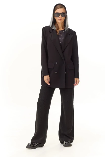 Жакет прямого силуэта. Застежка двубортная на петли и пуговицы. Воротник пиджачного типа. На переде карманы с клапаном. Рукав прямой двухшовный со шлицей по низу. В среднем шве спинки шлица. Жакет на подкладке. В комплекте съемный капюшон из трикотажного полотна.