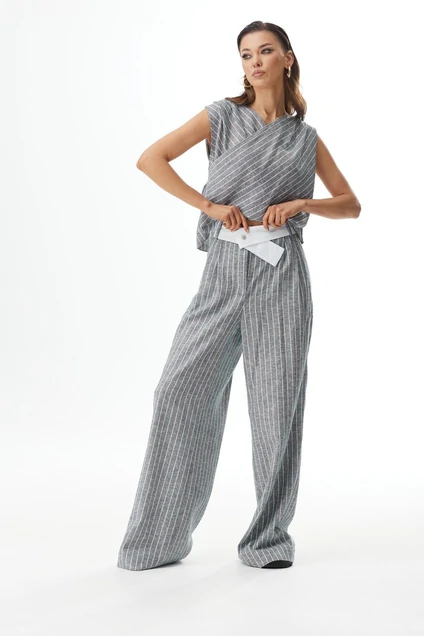 Комплект 2-х предметный: блузка и брюки.Блузка без рукавов. Вырез горловины V-образной формы. Застежка по спинке на петлю и пуговицу. Перед двойной с запахом.