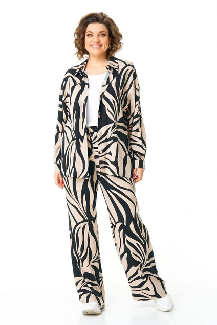 Комплект женский состоит из блузы, брюк и топа. Блуза свободного покроя со спущенной линией плеча. Центральная бортовая застёжка с планкой на петли-пуговицы Рукав втачной одношовный. Низ рукава с манжетой и складками. Спинка с кокеткой и встречной складкой. Воротник на отрезной стойке блузочного типа. Топ свободного покроя. Горловина округлой формы. Проймы и горловина окантованы. Брюки свободные прямого силуэта. Пояс притачной на резинке, регулируется шнуром с наконечниками. В боковых швах карманы.