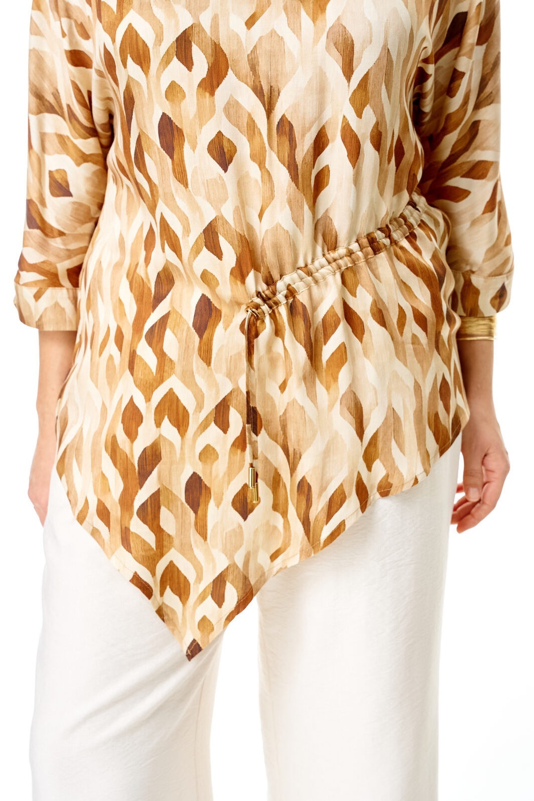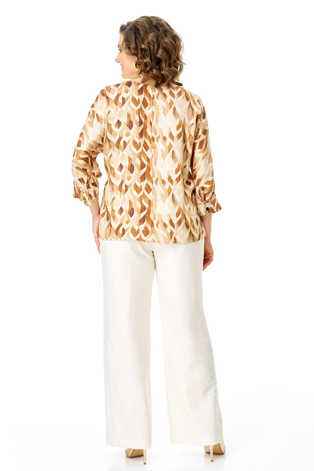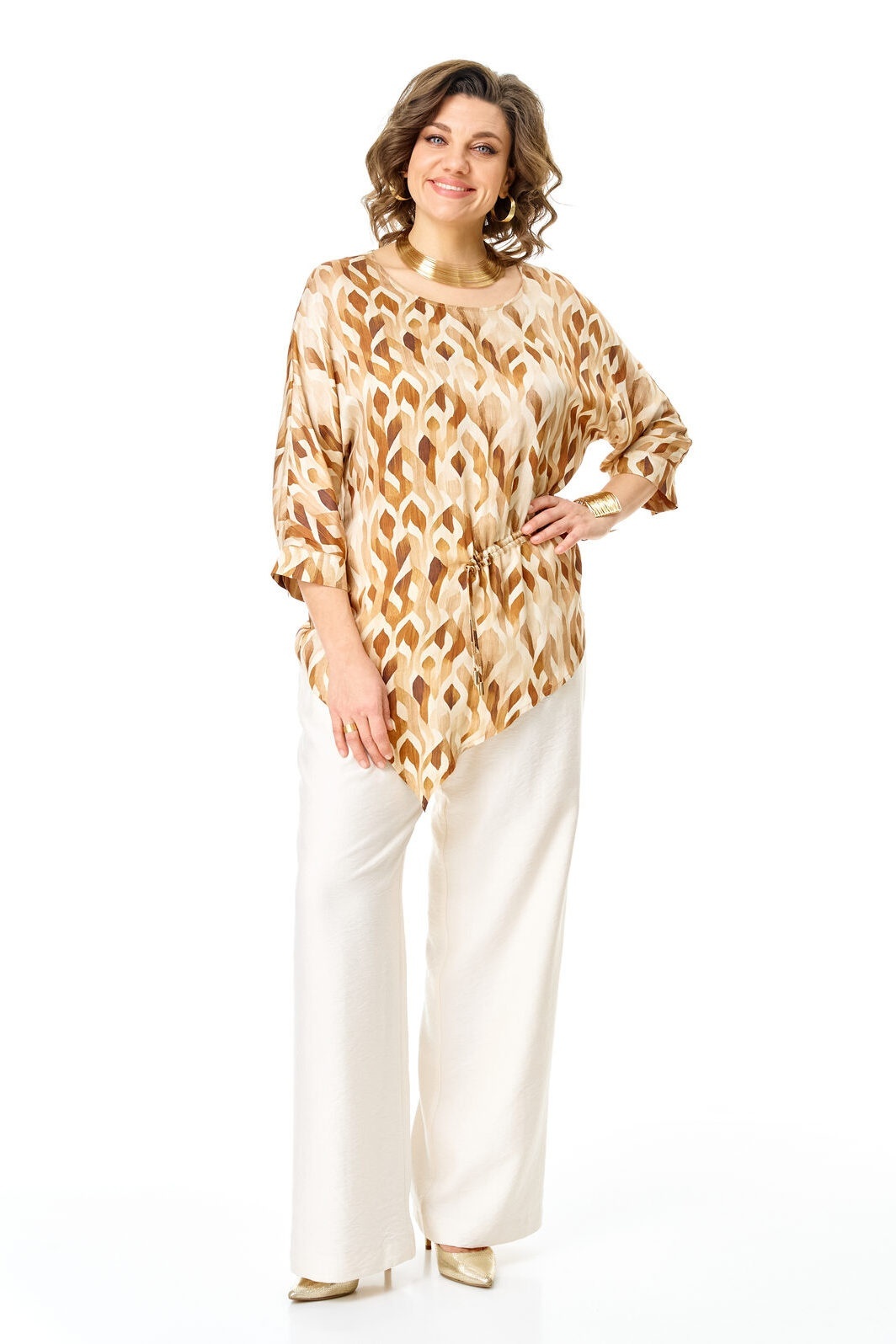 Костюм брючный 1264-1 облака+луковки VI ORO предоставляет уникальное сочетание стиля и комфорта. Коллекция бренда VI ORO знаменита своим вниманием к деталям и высоким качеством. Комплект изготовлен из мягкой и приятной на ощупь вискозы с добавлением нейлона, что обеспечивает комфорт и долговечность. Блуза свободного силуэта с рукавом 3/4 типа 'летучая мышь', дополнена элегантными манжетами и кулисой с фиксатором. Ассиметричный низ добавляет современный штрих, а удобные брюки на резинке с боковыми карманами делают костюм функциональным. Идеально подходит для весенне-летнего сезона благодаря легкому материалу и стильному дизайну с абстрактным принтом в теплых оттенках.