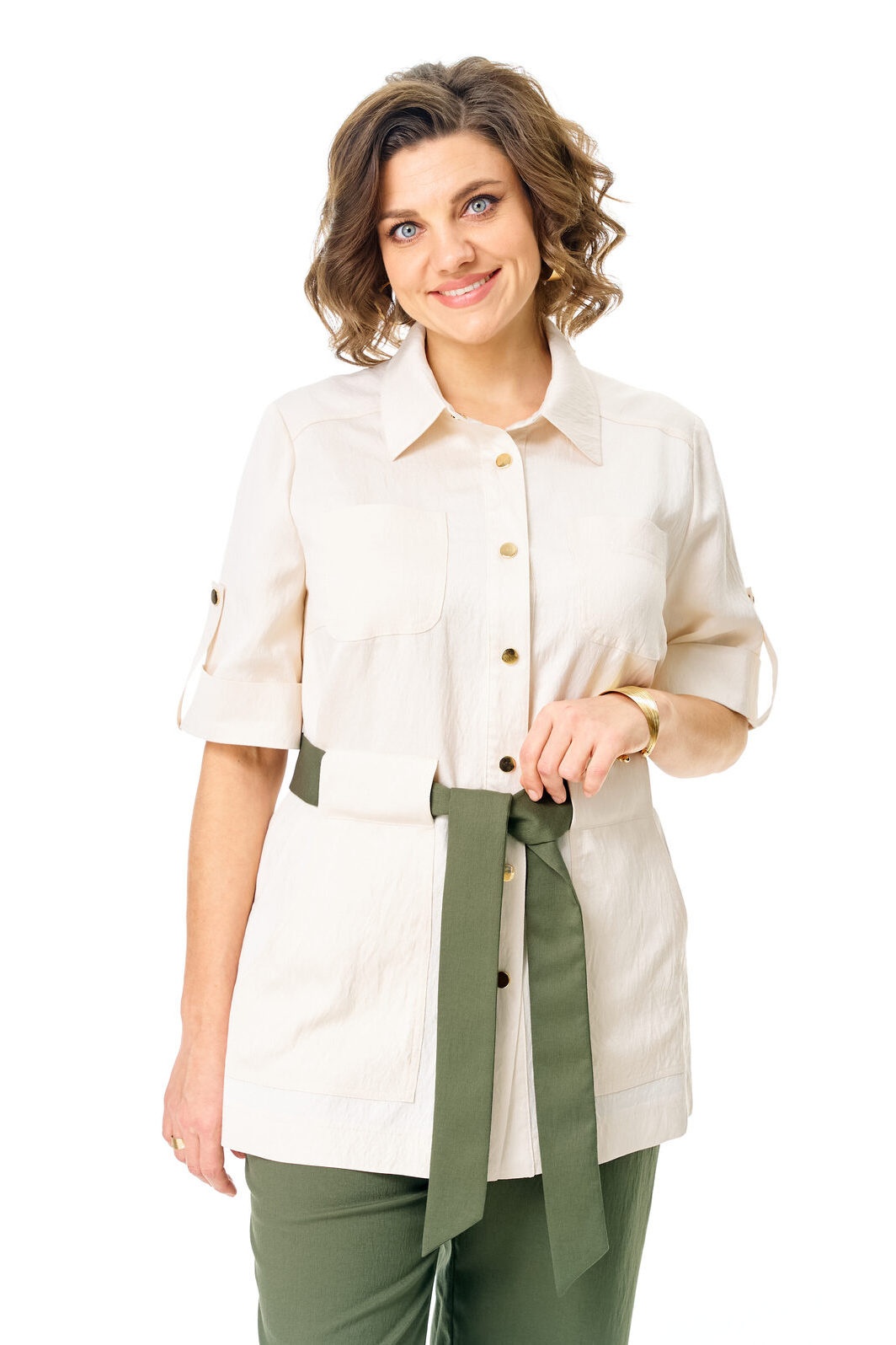 Костюм брючный 1265 молоко+оливка VI ORO предлагает идеальное сочетание стиля и комфорта. Коллекция бренда VI ORO представляет жакет прямого свободного покроя с естественной линией плеча, выполненный из 85% вискозы и 15% нейлона, предоставляя легкость и прочность. Центральная бортовая застежка, отложной воротник и накладные карманы с патами создают современный и удобный фасон. Брюки свободного прямого силуэта с притачным поясом на резинке и боковыми карманами обеспечивают комфорт на протяжении всего дня. Костюм выполнен в молочном и оливковом цветах, прекрасно подходит для весенне-летнего сезона и стильных прогулок.