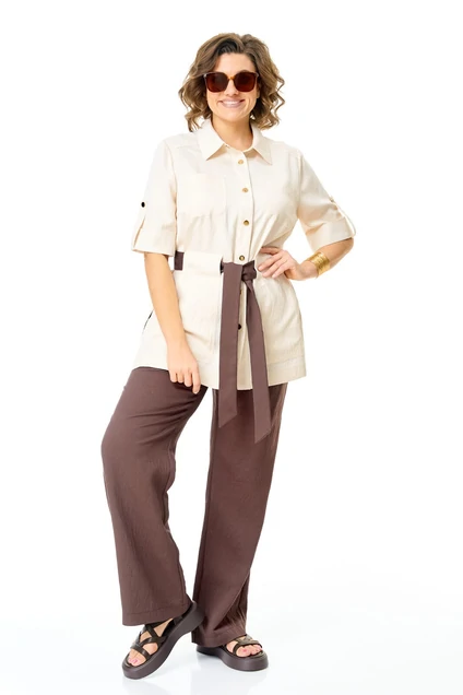 Костюм брючный 1265 молоко+шоколад VI ORO от коллекции бренда VI ORO сочетает в себе стиль и практичность. Изготовленный из вискозы с добавлением нейлона, костюм отличается своей легкостью и удобством. Жакет имеет прямой крой с коротким рукавом и центральной застежкой на кнопки, а также оснащён накладными карманами, которые подчеркивают его практичность. Контрастный пояс придает образу завершенность. Брюки свободного кроя также с карманами, что делает их идеальными для повседневной носки. Костюм представлен в нежных оттенках молочного и шоколадного цветов, что делает его универсальным для разных сезонов. Подходит для офисного и повседневного стиля.
