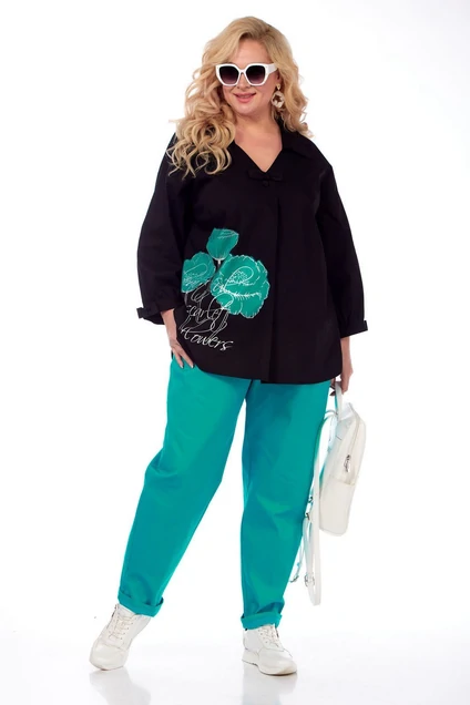 Комплект блуза + брюки в стиле оверсайз. Блуза свободного силуэта спущенный рукав, низ рукава с манжетой, на манжете настрочены бантики . На полочке нагрудная выточка и складка на складке настрочен бантик и пришита пуговица, с правой стороны полочки нанесен принт «цветы». Горловина обработана обтачкой и воротником. Брюки свободного силуэта с боковыми карманами верхний срез брюк обработан поясом, в пояс вставлена резинка и регулируется шнурком .