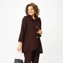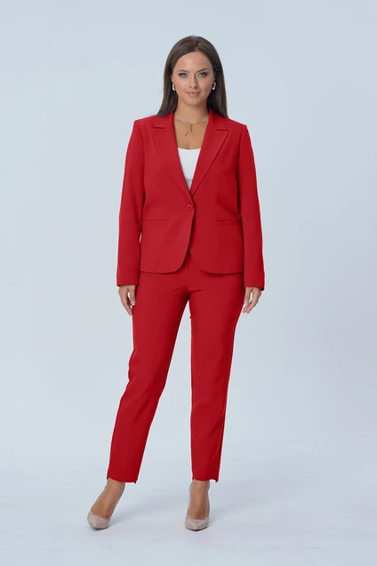 Костюм женский двухпредметный, состоящий из жакета и брюк. Жакет полуприлегающего силуэта с центральной бортовой застёжкой на одну петлю-пуговицу до линии перегиба лацкана. Перед с талиевой вытачкой и прорезным карманом с листочкой с втачными концами. Спинка со средним швом. Рукав втачной двухшовный длинный. Воротник пиджачного типа. Брюки классического кроя, слегка зауженные к низу с притачным поясом с резинкой по задним половинкам брюк. Брюки с наклонным к боковому шву карманом и двумя фигурными хлестиками на одну пуговицу по поясу передних половинок. Застёжка на тесьму - молнию и одну петлю-пуговицу по поясу. Низ брюк имеет фигурную форму - укорочена по передним половинкам и удлинённые по задним. Длина жакета по спинке - 59 см. Длина рукава - 61 см. Длина брюк по боковому шву - 96 см.