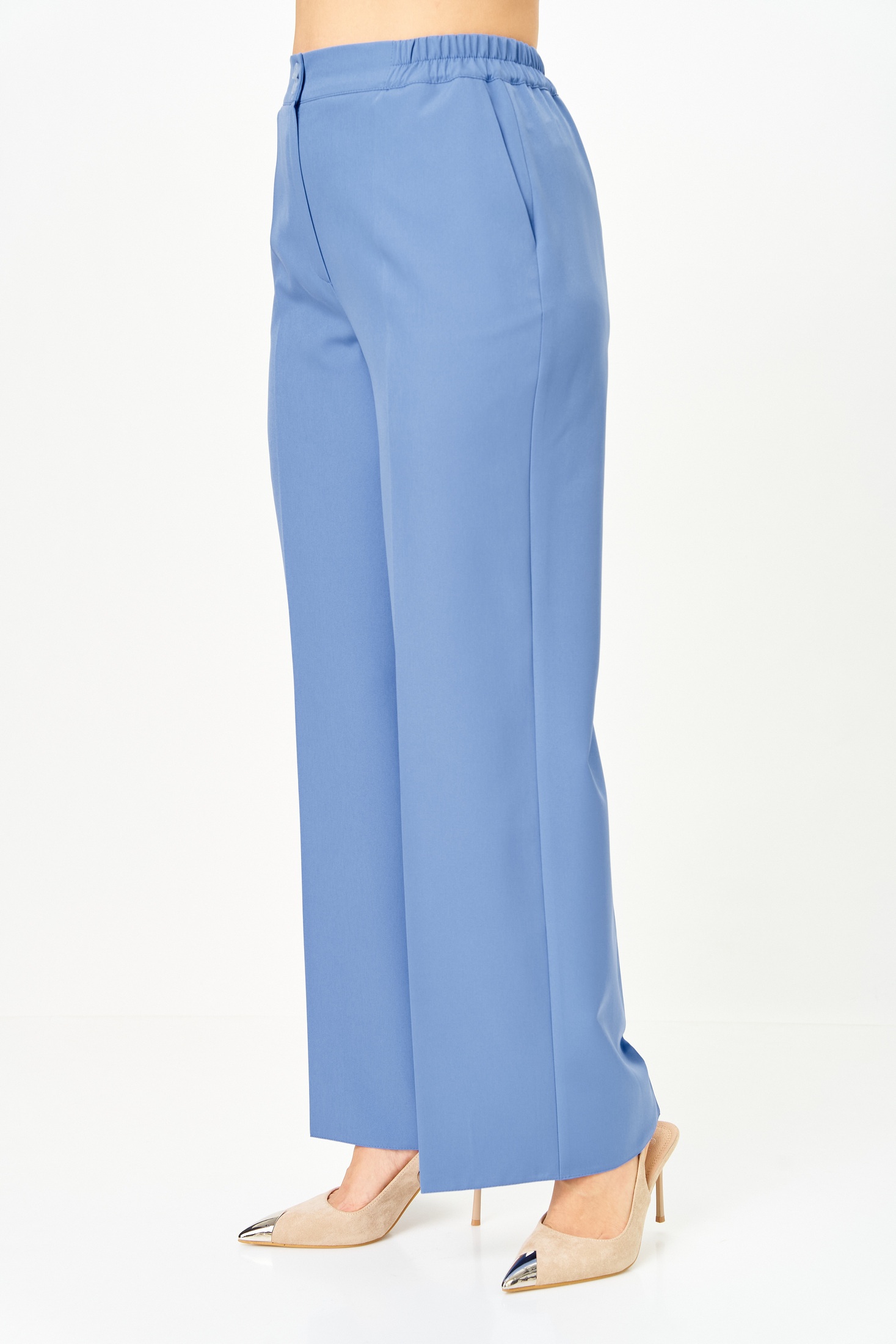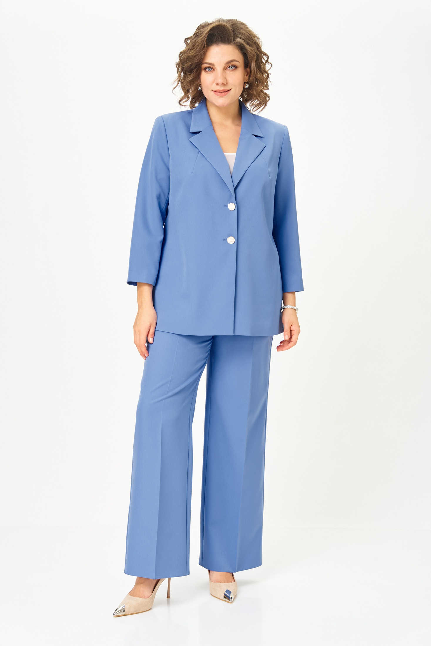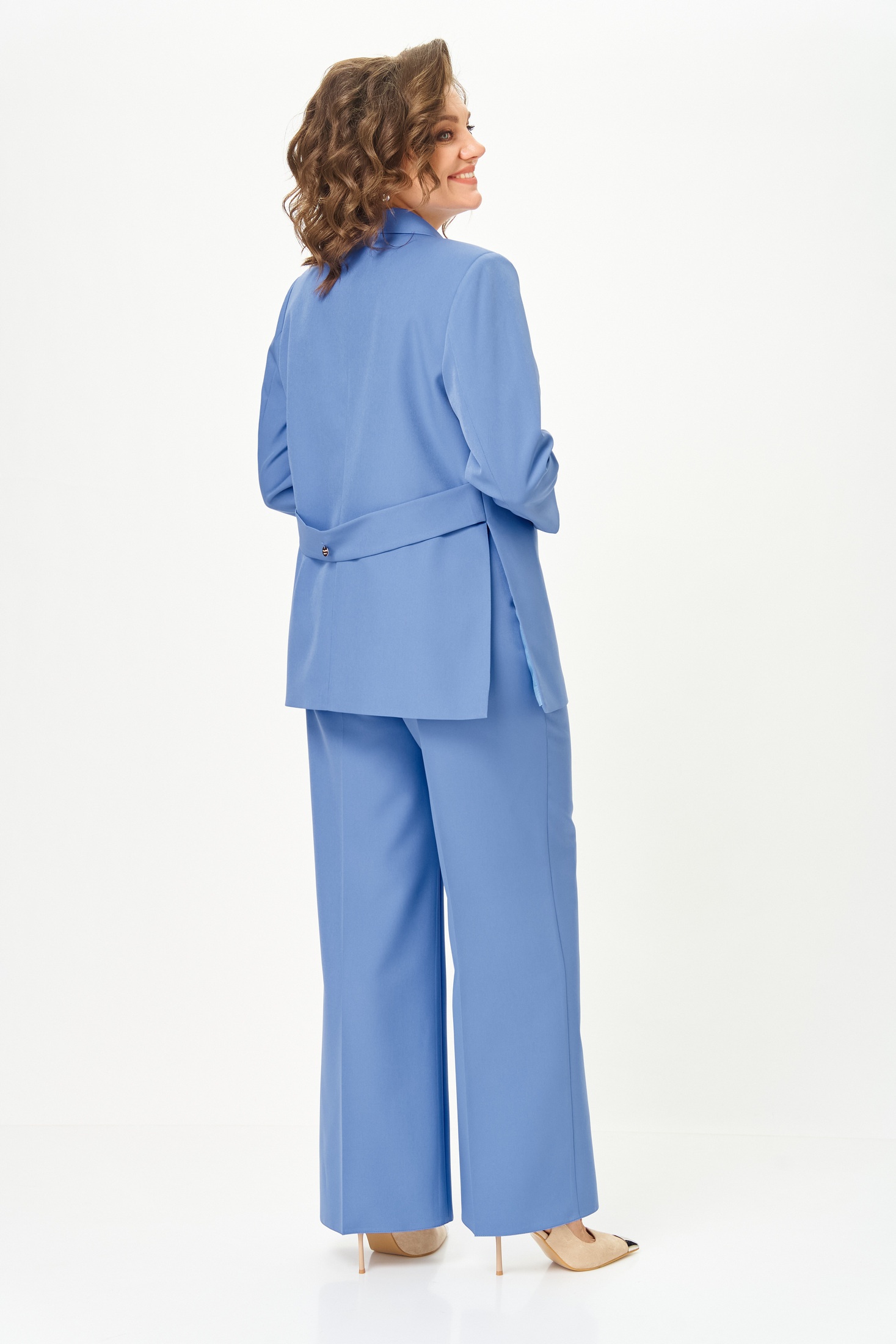 Костюм женский двухпредметный, состоящий из жакета и брюк. Жакет полуприлегающего силуэта, удлиненный, с центральной бортовой застежкой на 2 петли-пуговицы до линии перегиба лацкана. Перед с нагрудными вытачками, выходящими из горловины. Боковые швы с разрезами, между которыми по спинке вставлен пояс фигурной формы с декоратичной нашивкой. Спинка со средним швом. Воротник пиджачного типа. Рукава втачные двухшовные длиной 3/4. Брюки палаццо с притачным широким поясом на резинке от заутюженных стрелок по передней половинке вкруговую. Застежка на тесьму-молнию в средних срезах передних половинок брюк и 2 петли-пуговицы по поясу.