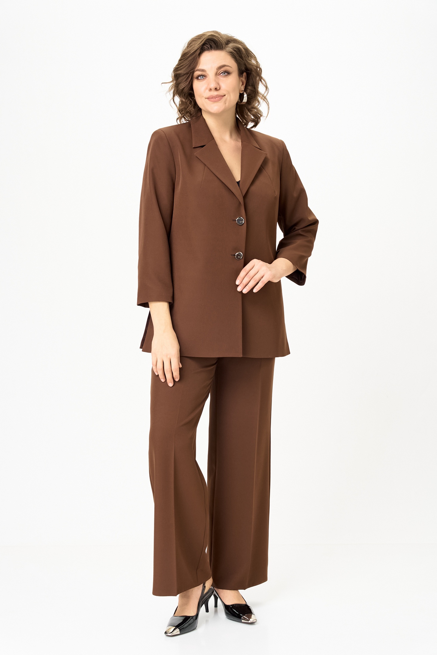 Костюм женский двухпредметный, состоящий из жакета и брюк. Жакет полуприлегающего силуэта, удлиненный, с центральной бортовой застежкой на 2 петли-пуговицы до линии перегиба лацкана. Перед с нагрудными вытачками, выходящими из горловины. Боковые швы с разрезами, между которыми по спинке вставлен пояс фигурной формы с декоратичной нашивкой. Спинка со средним швом. Воротник пиджачного типа. Рукава втачные двухшовные длиной 3/4. Брюки палаццо с притачным широким поясом на резинке от заутюженных стрелок по передней половинке вкруговую. Застежка на тесьму-молнию в средних срезах передних половинок брюк и 2 петли-пуговицы по поясу.
