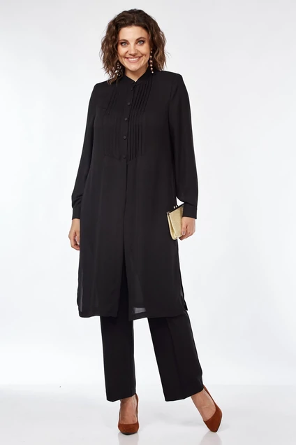 Комплект женский двухпредметный, состоящий из туники и брюк. Туника женская удлинённая из ткани креп прямого силуэта, с центральной бортовой застёжкой по планке на 5 петель и пуговиц и одну петлю и пуговицу на воротнике. Детали переда с фигурным подрезом и 5 защипами на 0,5 см. Планка обработана до подреза. Спинка с застроченной встречной складкой от горловины. Боковые швы туники с разрезами. Воротник - отрезная стойка. Рукава одношовные с притачными манжетами, застёгивающимися на 2 петли-пуговицы. По швам притачивания манжет закладывается 2 односторонние складочки. Разрезы рукавов обработаны окантовкой. Брюки женские прямого силуэта с притачным поясом на резинке по задним половинкам и с застёжкой на тесьму молнию в средних срезах передних половинок и 1 петлю-пуговицу по поясу. По передним и задним половинкам заутюженные канты. Длина туники по спинке - 104 см. Длина рукава - 61 см. Длина брюк по боковому шву от пояса до низа - 99 см. Туника: Полиэстер-100%.