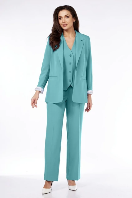 Костюм женский 3-х предметный, полуприлегающего силуэта. Состоит из жакета и жилета на подкладке и брюк. Жакет с воротником пиджачного типа, центральной застёжкой на 1 петлю и 1 пуговицу. Перед с рельефными швами от пройм до низа и талиевыми вытачками и прорезными карманами с листочками с втачными концами. Спинка со средним швом. Рукав втачной, двухшовный, длинный со шлицей. Жилет с рельефными швами от пройм до низа по переду и спинке, с центральной застёжкой на 4 петли и 4 пуговицы. Перед с прорезными карманами с листочками с втачными концами. Брюки с застёжкой на тесьму "молнию" в средних срезах передних половинок, с притачным поясом на 1 петлю и 1 пуговицу и резинкой по задним половинкам, с карманами наклонными к боковым швам. По передним и задним половинкам заутюженные канты. Длина жакета по спинке - 71 см. Длина рукава - 61 см. Длина жилета по спинке - 54 см. Длина брюк по боковому шву - 101 см.