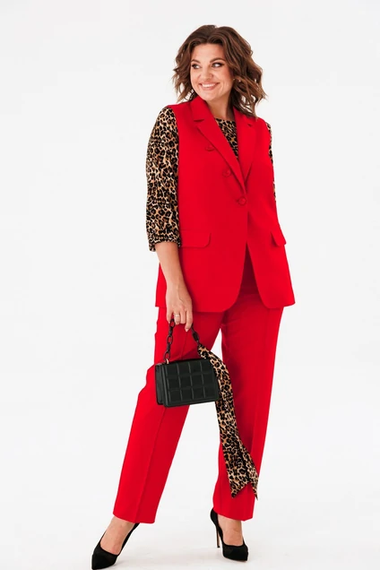 Костюм женский трёхпредметный, состоящий из жилета на подкладке, брюк и блузки. Жилет полуприлегающего силуэта, длиной до бёдер, с центральной бортовой застёжкой на 1 петлю-пуговицу до перегиба лацкана и 2 отделочные вдоль лацкана. Детали переда с отрезными бочками, передними вытачками и боковыми прорезными карманами с клапаном и двумя обтачками. Спинка со средним швом, заканчивающимся шлицей. Воротник пиджачного типа. Брюки классического силуэта, слегка зауженные к низу, с притачным поясом на резинке по задним половинкам и с застёжкой на тесьму-молнию в средних срезах передних половинок и 1 петлю-пуговицу по поясу. Брюки с наклонным к боковому шву карманом и заутюженными кантами. Блузка из принтованной ткани прямого силуэта со съёмным шарфом. Перед с нагрудными вытачками, выходящими из боковых швов. Спинка со средним швом, в котором обработана застёжка на навесную петлю и пуговицу. Горловина овальной формы. Рукав одношовный, длиной 3/4 с широкой подгибкой для возможности завернуть манжет. Длина жилета по спинке 70 см. Длина блузы по спинке - 64 см. Длина брюк по боковому шву - 99 см. Блузка: Полиэстер - 100%