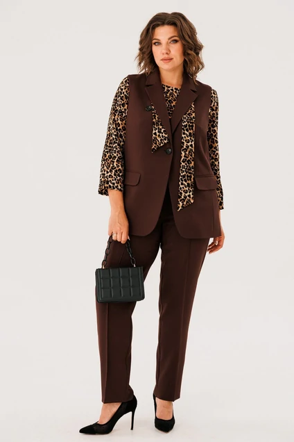Костюм женский трёхпредметный, состоящий из жилета на подкладке, брюк и блузки. Жилет полуприлегающего силуэта, длиной до бёдер, с центральной бортовой застёжкой на 1 петлю-пуговицу до перегиба лацкана и 2 отделочные вдоль лацкана. Детали переда с отрезными бочками, передними вытачками и боковыми прорезными карманами с клапаном и двумя обтачками. Спинка со средним швом, заканчивающимся шлицей. Воротник пиджачного типа. Брюки классического силуэта, слегка зауженные к низу, с притачным поясом на резинке по задним половинкам и с застёжкой на тесьму-молнию в средних срезах передних половинок и 1 петлю-пуговицу по поясу. Брюки с наклонным к боковому шву карманом и заутюженными кантами. Блузка из принтованной ткани прямого силуэта со съёмным шарфом. Перед с нагрудными вытачками, выходящими из боковых швов. Спинка со средним швом, в котором обработана застёжка на навесную петлю и пуговицу. Горловина овальной формы. Рукав одношовный, длиной 3/4 с широкой подгибкой для возможности завернуть манжет. Длина жилета по спинке 70 см. Длина блузы по спинке - 64 см. Длина брюк по боковому шву - 99 см. Блузка: Полиэстер - 100%