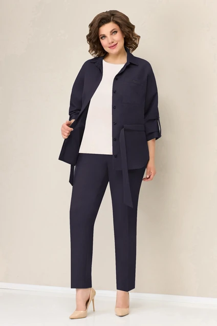 Жакет на потайной застежке,с пришивной кулисой и поясом, прямые классические брюки и блуза- универсальный комплект для различных вариантов носки. Длина жакета по центру спинки- 67см. Элегантный рукав с патой на цельнокроеной основе. Брюки прямые с высокой посадкой, с притачным поясом на резинке. Длина брюк по боковому шву- 100см. Блуза из легкого текстиля с принтом, со спущенным коротким рукавом. Длина блузы по центру спинки- 62см.