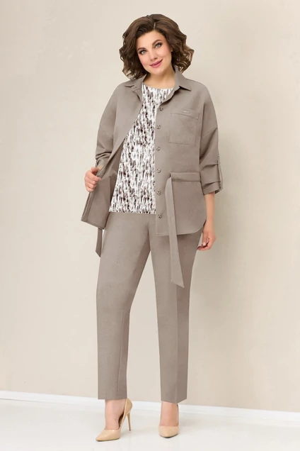 Костюм женский: жакет, брюки, блуза. Жакет на потайной застежке,с пришивной кулисой и поясом, прямые классические брюки и блуза- универсальный комплект для различных вариантов носки. Длина жакета по центру спинки- 67см. Элегантный рукав с патой на цельнокроеной основе. Брюки прямые с высокой посадкой, с притачным поясом на резинке. Длина брюк по боковому шву- 100см. Блуза из легкого текстиля с принтом, со спущенным коротким рукавом. Длина блузы по центру спинки- 62см.