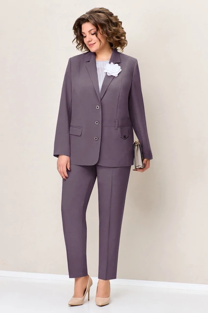 Костюм женский: жакет, брюки, блуза. Эффектный костюм-тройка: жакет классического кроя со вставкой из джинсового текстиля, прямые брюки из джинсовой ткани и легкая блуза. Однобортный жакет полуприлегающего силуэта с застежкой на пуговицы. Полочка жакета на подкладке, по спинке шлица. Длина жакета по центру спинки- 68см, длина рукава-63 см. Брюки прямые с высокой посадкой, с притачным поясом на резинке. Длина брюк по боковому шву- 100см. Блуза из легкого текстиля с рисунком клетка по переду, со спущенным коротким рукавом. Длина блузы по центру спинки- 59см. Брошь в комплекте изделия.Блуза: полиэстер 95%, эластан 5%.