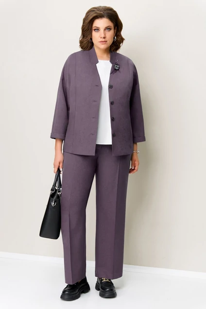 Костюм женский: жакет, брюки, блуза. Стильный жакет из легкого текстиля прямого силуэта с карманами и воротником полустойка. Длина жакета по центру спинки- 62см. Рукав спущенный с подворотом, длина рукава- 46см. Брюки прямые с высокой посадкой, с притачным поясом на резинке. Длина брюк по боковому шву- 102см. Блуза из легкого текстиля со спущенным рукавом. Длина блузы по центру спинки- 64см. Украшение-брошь в комплекте изделия. Блуза: полиэстер 95%, эластан 5%.