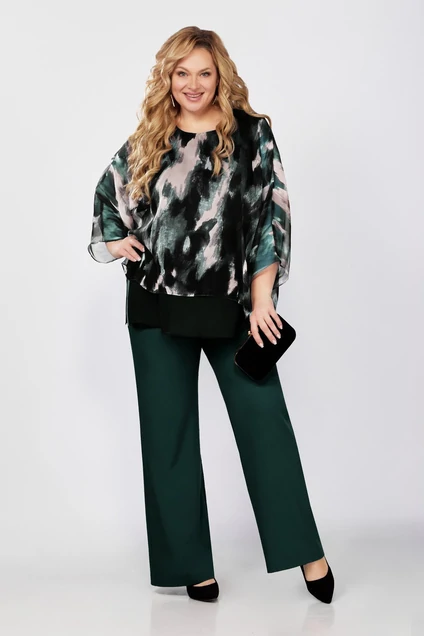 Костюм женский: блуза, брюки. Нарядная блуза из шифона свободного силуэта на подкладке. Длина блузы по центру спинки-73 см. Рукав блузы цельнокроеный. Брюки прямые свободные с высокой посадкой, с притачным поясом (в поясе- вставки с резинкой и застежка на молнию и пуговицу спереди). Длина брюк по боковому шву- 106см.